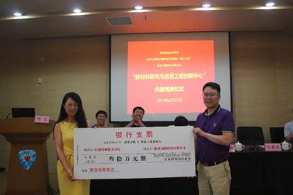 校领导、职能部门代表和合作方代表共同见证了“新材料研究与应用工程创新中心”的成立揭牌、教育发展基金和设备捐赠的仪式。合作企业为学校捐赠基金和设备金额达50万。