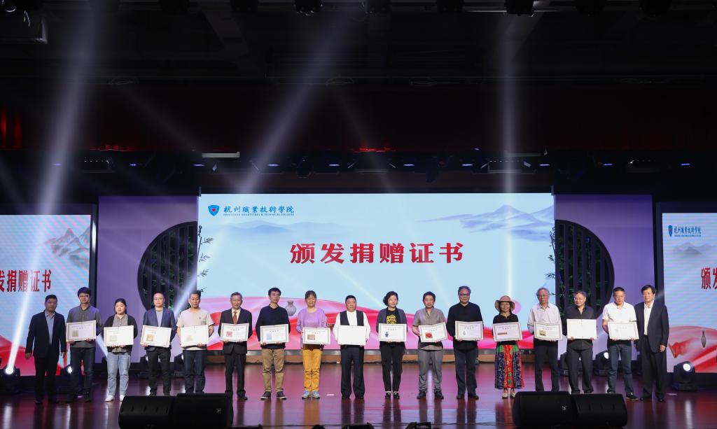 仪式上,金波、贾文胜为捐赠单位西泠印社社务委员会以及15位非遗大师、捐赠者颁发了捐赠证书。非遗大师代表屠燕治、教师代表白志刚、非遗班学生代表廖紫瑄作了交流发言。