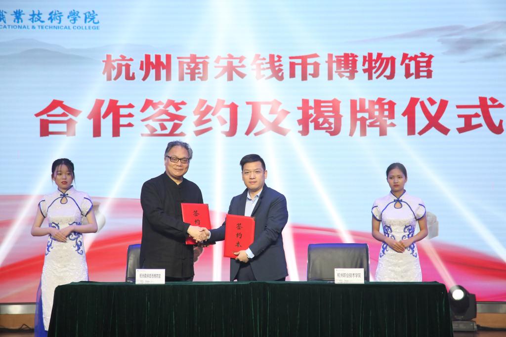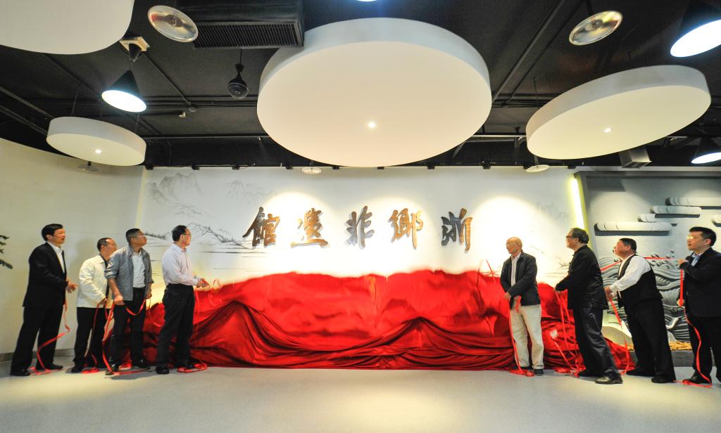 上级领导、非遗大师代表、捐赠者代表和我校党委书记金波、校长贾文胜共同为“浙乡非遗馆”揭幕;校长贾文胜与浙江省非遗协会会长、省文化厅原厅长杨建新共同为“传拓学堂”揭牌;校长贾文胜代表学校分别与西泠印社党委副书记、西泠印社常务副秘书长、西泠印社社务委员会副主任王宏伟,杭州南宋钱币博物馆馆长屠燕治进行了合作续约和签约。
