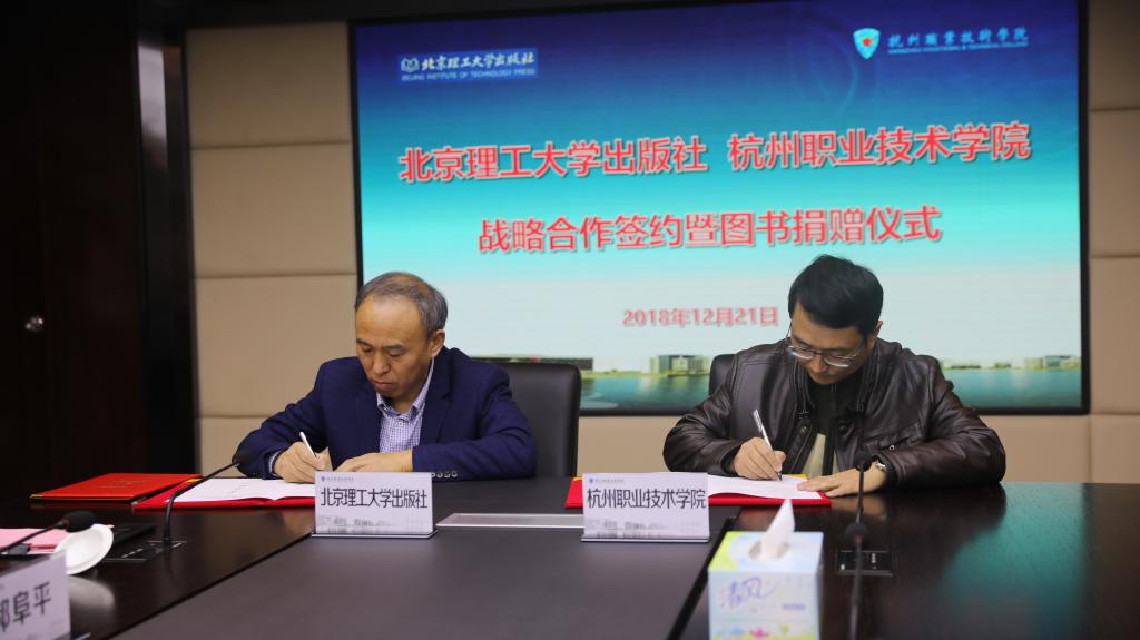 12月21日上午,我校与北京理工大学出版社在行政楼第一会议室举行了战略合作签约仪式,北京理工大学出版社总编樊红亮、浙江分社社长姚朝晖、分社策划编辑陈圆圆、杭州职业技术学院副校长楼晓春,专业建设指导处、创业学院、信息工程学院、图书信息中心相关负责人出席了此次签约仪式。