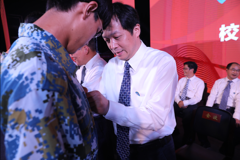 开学典礼上,校领导及嘉宾为新生代表佩戴了校徽。