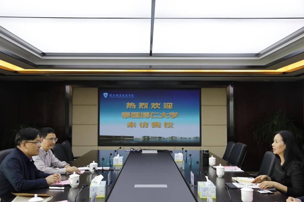 4月25日上午,泰国博仁大学浙江代表处主任余北京,浙江服务中心主任张超在洪永铿书记的陪同下来访我校,校长贾文胜,国际交流合作处负责人参与接待。