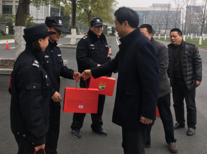 2 月15日 上午,党委书记金波、纪委书记陈泉淼带领党政办、后勤保障处、保卫处等部门的相关人员来到校南大门岗亭、监控室、含晖苑、网络中心,看望慰问节日期间仍然奋战在工作第一线的职工们,为他们送去了新春的祝福和慰问品。