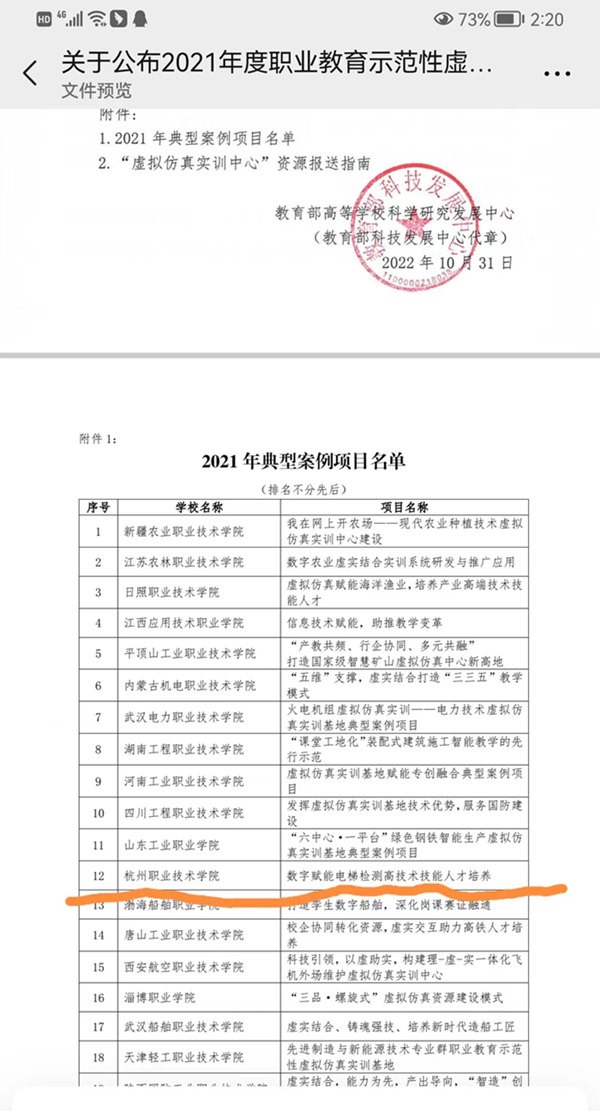 日前,教育部公布了2021年度职业教育示范性虚拟仿真实训基地培育项目典型案例,我校特种设备学院报送的项目“数字赋能电梯检测高技术技能人才培养”成功入选。