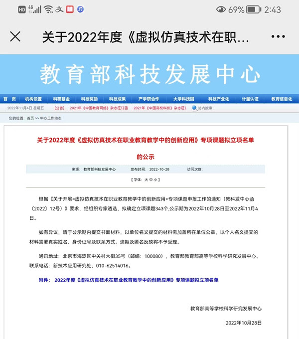 专项课题的立项研究,对于助力职业教育数字化升级,探索虚拟仿真赋能职业教育教学的新思路、新模式、新机制,进一步推动国家职业教育虚拟仿真示范实训基地及职业教育示范性虚拟仿真实训基地建设有着积极的促进作用。