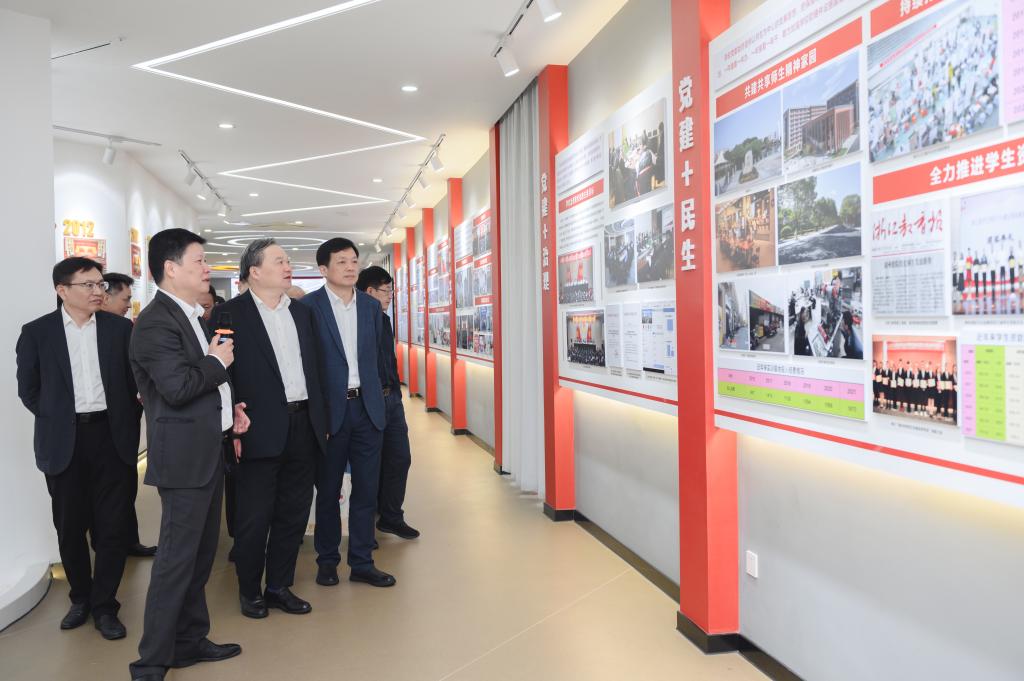 会前,与会领导嘉宾调研了湖州职业技术学院党群服务中心,该校党委书记周家健向来宾介绍了党建“五个起来”以及“党建+人才”“党建+育人”“党建+服务”“党建+文化”“党建+群团”的实践做法。