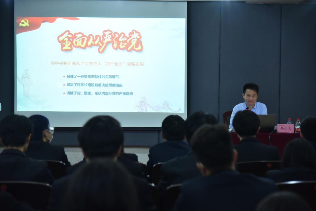 高云飞围绕“党要管党”、“从严治党”、“坚持不懈”三个方面展开。他首先就过去五年“中国式现代化”的发展和多个关键事件,总结道十八大以来的中国是“极不平凡,极不寻常”的。随后又抛出“新时代从什么时候开始”、“新在哪里”两个问题,引起了现场学生干部的积极互动讨论,之后诠释道:“新时代从十八大开始,新的地方在于有了新的思想。”同时,他又列举了多个典型案例总结出中央八项规定以及“反腐斗争”所取得的巨大成果:治党由“宽、松、软”转变为“严、紧、硬”。最后,高云飞书记以“九个坚持”为标准,要求学生干部要“扣好第一粒扣子,廉洁做人,廉洁从业”。