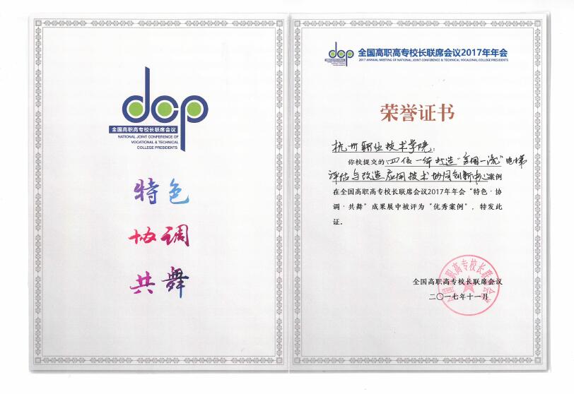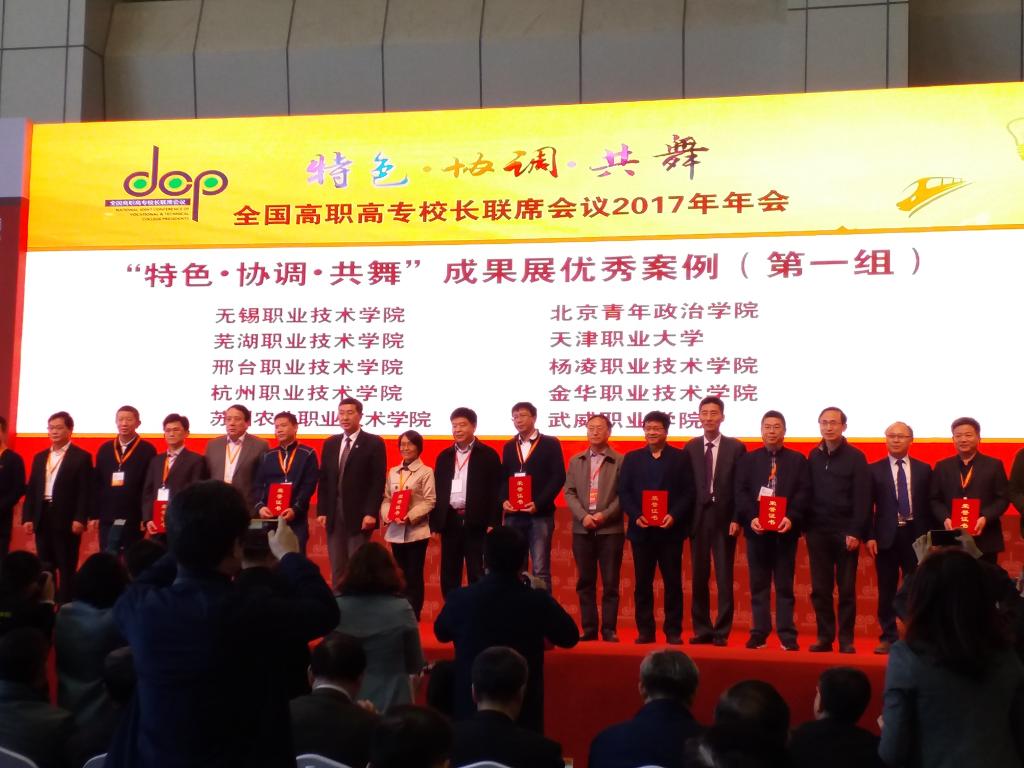 会议举办了“特色·协调·共舞”成果展,我校报送的“四位一体打造‘全国一流’电梯评估与改造应用技术协同创新中心”、“承办‘一带一路’暨金砖国家技能发展与技术创新大赛,服务国家‘一带一路’倡议”、“基于管家学校的物业管理专业现代学徒制培养模式”、“依托政企校电梯人才培养联盟,实现贫困地区学生体面就业”四个典型案例全部入围,在大会现场进行展出和交流。其中,“四位一体打造‘全国一流’电梯评估与改造应用技术协同创新中心”案例,通过网络评审、现场投票和专家评审,从全国491个案例中脱颖而出,进入20强,被评为“优秀案例”并获表彰。