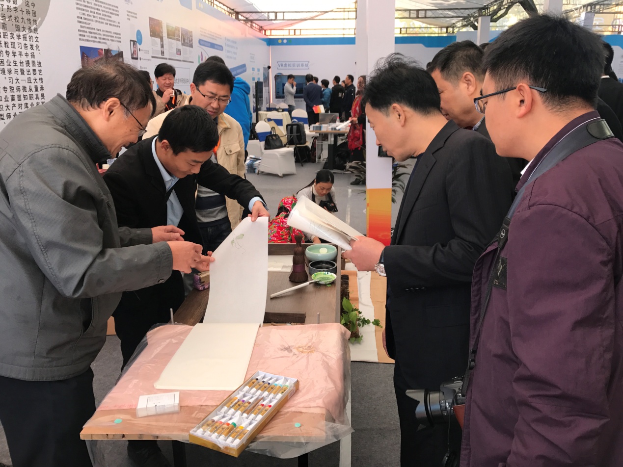 在年会上,我校主持的国家级职业教育“传统手工业(非遗)技艺传习传承与创新”专业教学资源库项目受邀参展,其中雕版印刷作为中华传统技艺展演活动现场非常热闹。国家级非遗项目雕版印刷传承人黄小建老师带领我校学生通过现场展示和讲解,使参会院校长在现场近距离地观看了印刷的全过程,体验了雕版印刷技艺,了解了雕版印刷的历史,认识了雕版的材质——梨木、印刷所用的宣纸、鬃刷,从中感受到雕版印刷独特的存在价值和中国传统文化的魅力。