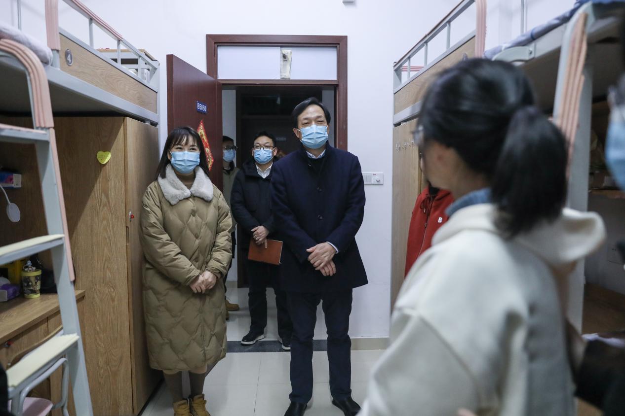 “家乡是哪里的?线上上课还适应吗?学校生活适应吗?”金波书记一走进学生宿舍,就亲切地向同学们询问了学习进展、生活情况、期末备考的复习安排等问题,仔细倾听了学生诉求,了解学生心理状况,勉励同学们根据教学进度,完成网上学习,嘱咐大家要加强个人防护、错峰返乡。在走访过程中,金书记还关注到学生寝室楼层较高,搬运行李不便等问题,强调要第一时间回应学生诉求,不断优化管理服务,学校也将为返乡学生提供免费爱心送站服务,为广大学生营造安全、舒适、便利的校园环境。