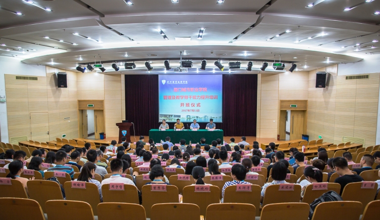 7月11日上午,由我校承办的“高职院校管理及教学骨干能力提升培训班”在行政楼二楼报告厅举行了开班仪式。杭州职业技术学院副校长陈加明、厦门城市职业学院党委委员、校长助理、教务处处长吴松青,厦门城市职业学院党委委员、办公室主任王育培、继续教育学院品牌项目部主任牛静以及厦门城市职业学院的108名学员出席开班仪式,开班仪式由牛静主任主持。