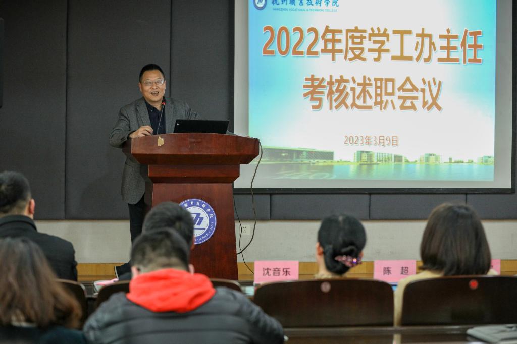 述职结束,陈泉淼发表总结讲话,他肯定了学工队伍过去一年的辛苦付出,面对诸多挑战依然迎难而上,出色地完成了各项学生工作。他将学工办主任工作的重要性比作身体的“腰部”,在整个身体中既要保证双腿强健有力,更要支撑起上身的挺拔之姿,发挥好承上启下的重要作用。陈泉淼要求全体学工办主任,第一,有激情。要始终保持对学生工作的热情;第二,讲统筹。要整合优势资源提升学生工作效能;第三。夯基础,要脚踏实地地筑牢学生工作基础;第四,建品牌,将杭职学工打造为叫得响的品牌;第五,带队伍。以老带新,快速提升新辅导员的综合能力和专业素养。