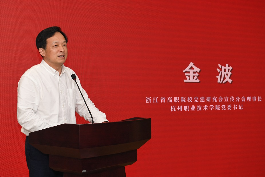 浙江省高职院校党建研究会宣传分会理事长、杭州职业技术学院党委书记金波,浙江日报报业集团党委委员、专职副书记金炳雄,浙江省高职院校党建研究会会长、浙江金融职业学院原党委书记周建松,浙江日报报业集团编委、浙江共产党员杂志集团总编辑、红旗出版社社长褚定华,浙江日报全媒体评论理论部主任潘如龙,红旗出版社总编辑杨霞云,红旗出版社副总经理王晓宇,浙江经济职业技术学院党委委员、组织部部长、宣传统战部部长陈专,杭州职业技术学院马克思主义学院院长、党总支书记邹宏秋,浙江交通职业技术学院宣传统战部副部长林小平,浙江长征职业技术学院马克思主义学院思政教研室主任姚渝滢,以及浙江高职院校党建研究会宣传分会单位代表、杭州职业技术学院师生代表参加活动。活动由杭州职业技术学院宣传部副部长伏志强主持。金炳雄、周建松、金波分别致辞。