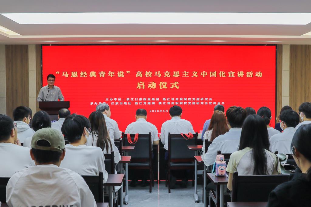 习近平总书记在党的二十大报告中指出“中国共产党为什么能,中国特色社会主义为什么好,归根到底是马克思主义行,是中国化时代化的马克思主义行”。为进一步学习贯彻党的二十大精神和深入开展习近平新时代中国特色社会主义思想主题教育工作,5月26日下午,由浙江日报报业集团和浙江省高职院校党建研究会主办,红旗出版社、浙江党建网、浙江省高职院校党建研究会宣传分会承办的“马恩经典青年说”高校马克思主义中国化宣讲活动,在杭州职业技术学院正式启动。