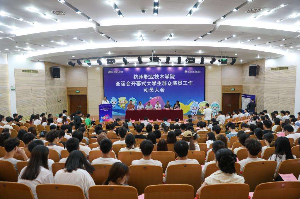 6月20日,杭州职业技术学院杭州亚运会开幕式大学生群演动员大会在行政楼二楼报告厅举行,校党委副书记陈泉淼,亚组委开闭幕式指挥中心办公室副主任、仪式演出专班负责人朱燕锋,省教育厅校安处一级调研员胡惠华,亚(残)运会开闭幕式仪式演出群演保障组主任沈晓峰,亚运会开幕式执行导演孟可,亚运会开闭幕式策划统筹、亚残运会开幕式执行导演刘洋,杭州亚运会和导演组相关工作人员;学校相关职能部门负责人、各二级学院分管学生工作的书记(副书记)、开幕式学生演员及领队教师等参加会议。会议由学工部部长江平主持。