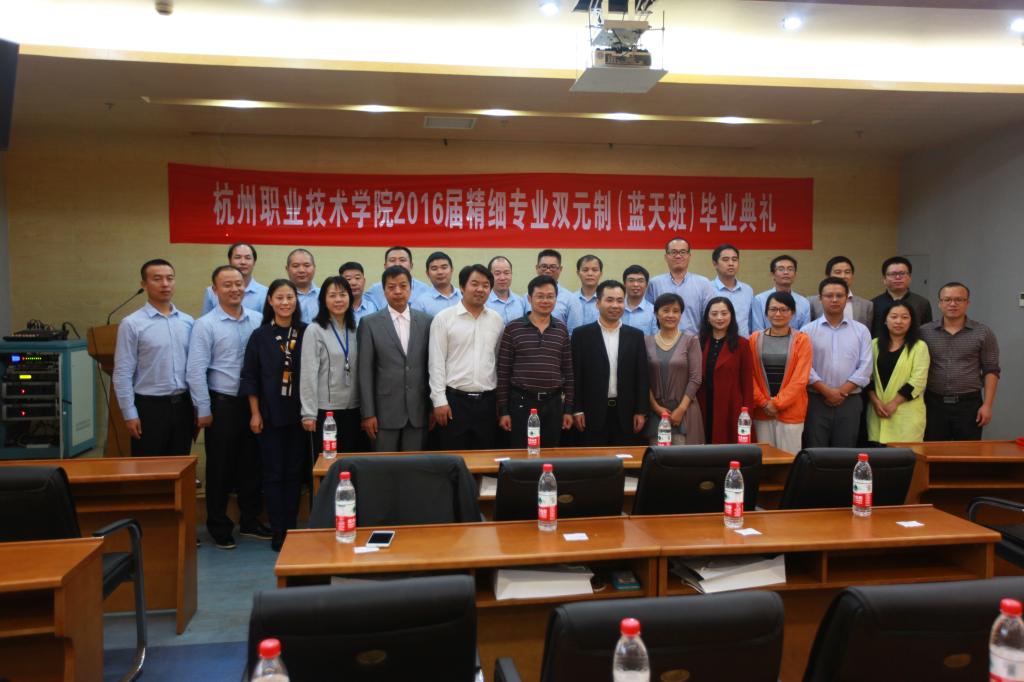 10月21日下午,临江学院2016届精细专业“双元制”蓝天班毕业典礼在图书馆第六会议室隆重举行。中化蓝天集团有限公司副总经理兼浙江蓝天环保高科技股份有限公司董事长、总经理王军,浙江蓝天环保高科技股份有限公司副总经理刘建鹏,人力资源部负责人杨清纳及蓝天环保双元制班全体毕业生参加了典礼。我校副校长张洪宪,临江学院、继续教育学院相关人员出席。临江学院副院长何艺主持典礼。