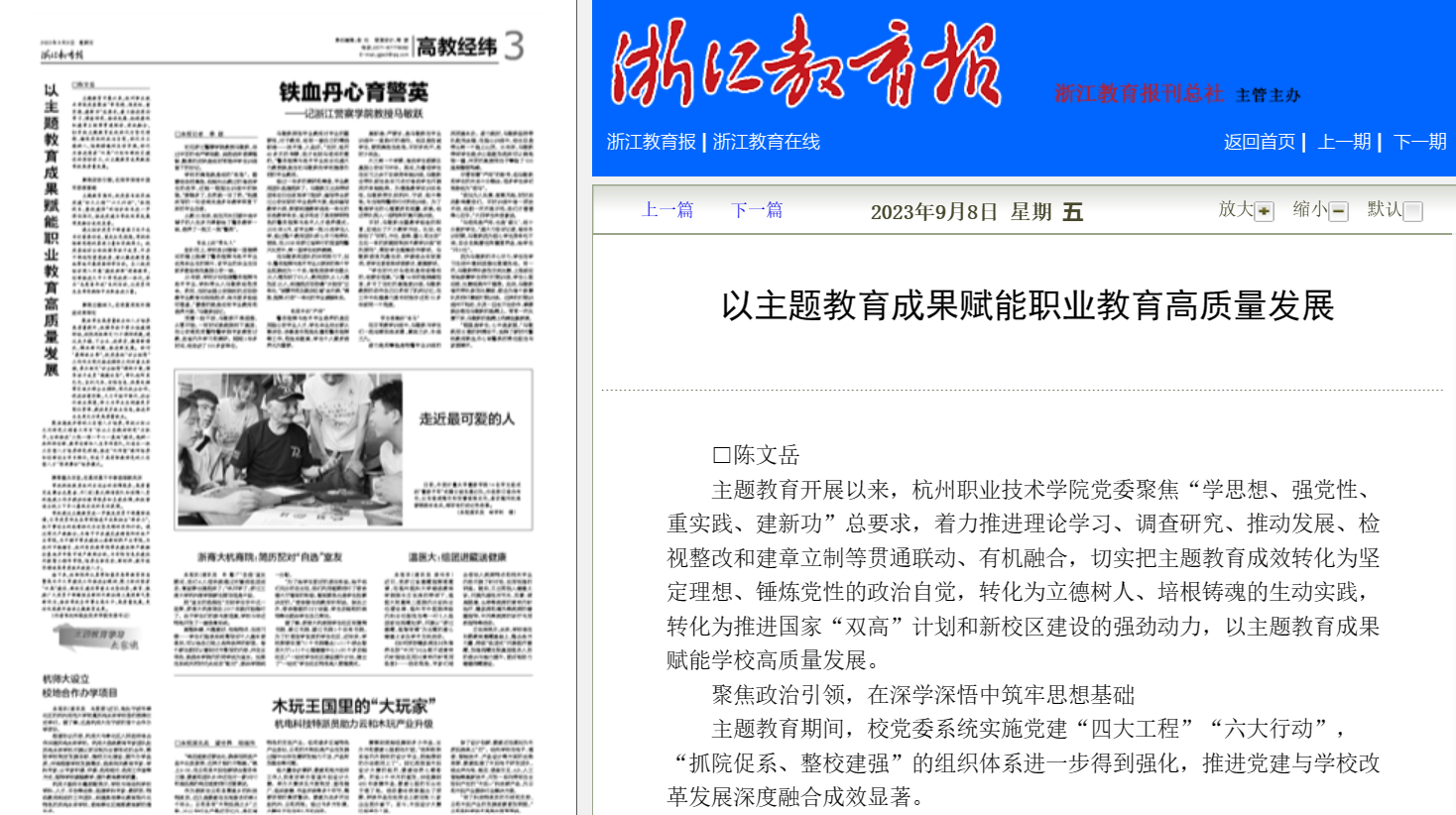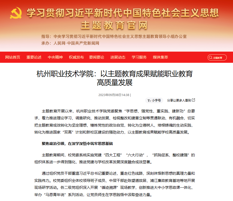 9月8日,杭职院召开了学习贯彻习近平新时代中国特色社会主义思想主题教育总结会议。当日,我校党委书记陈文岳的署名文章《以主题教育成果赋能职业教育高质量发展》在《浙江教育报》刊发,随后该文相继被国家主题教育官网、光明网、中国日报网、金台资讯、中国教育在线、学习强国等国内10余家主流媒体广泛转载报道,这是对杭职院开展主题教育工作成效的充分肯定。