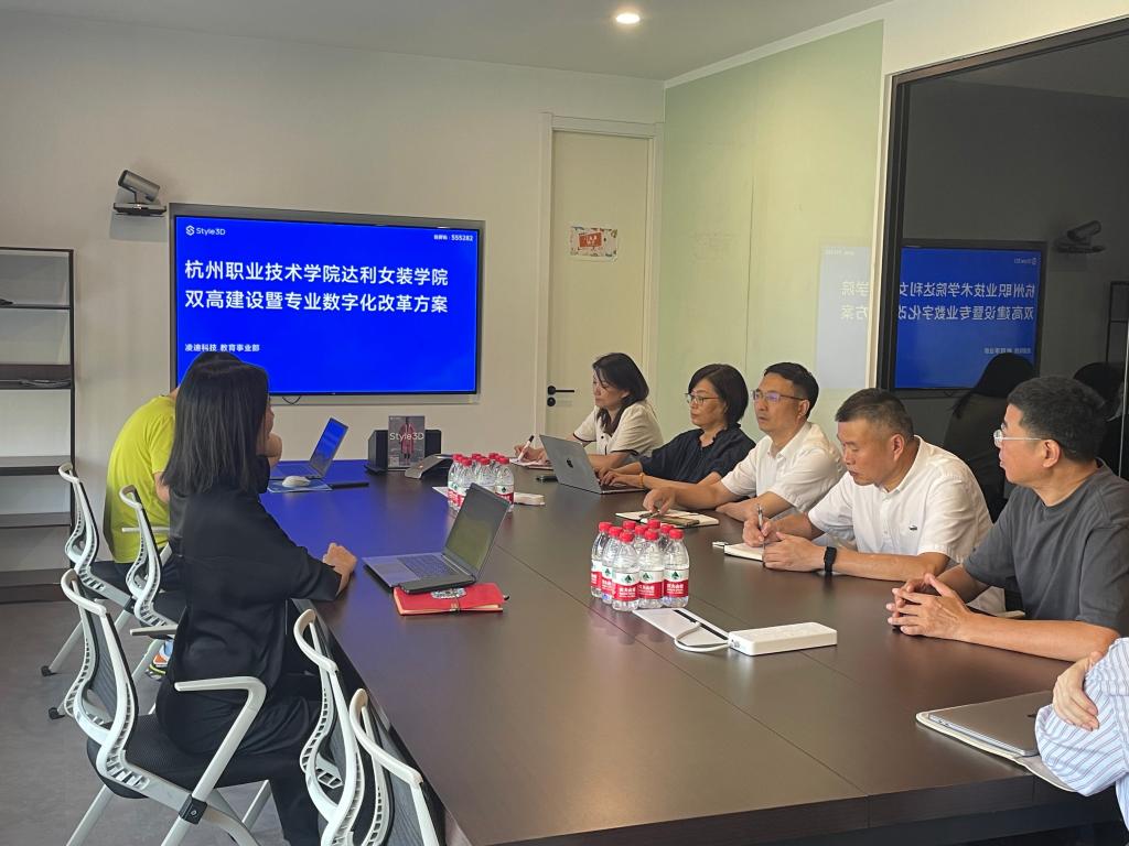 双方围绕职业教育、服装的数字化发展、双高专业建设等主题开展深入交流。凌迪公司教育事业部总经理董灵丽细致讲解了公司在服装产业、针织产业、家纺产业的数字化解决方案的技术要点,分享了凌迪科技在桐乡、海宁的数字化建设成果。凌迪公司总经理刘郴表示企业致力于推动时尚产业的数字化、智能化,介绍了公司在职业教育教学领域开发的相关资源,表示凌迪公司高度重视杭州职业技术学院的来访,希望今后能与学校在数字化资源库建设、人才培养、数字化课程建设、数字化行业的标准制定等方面有进一步的交流合作。