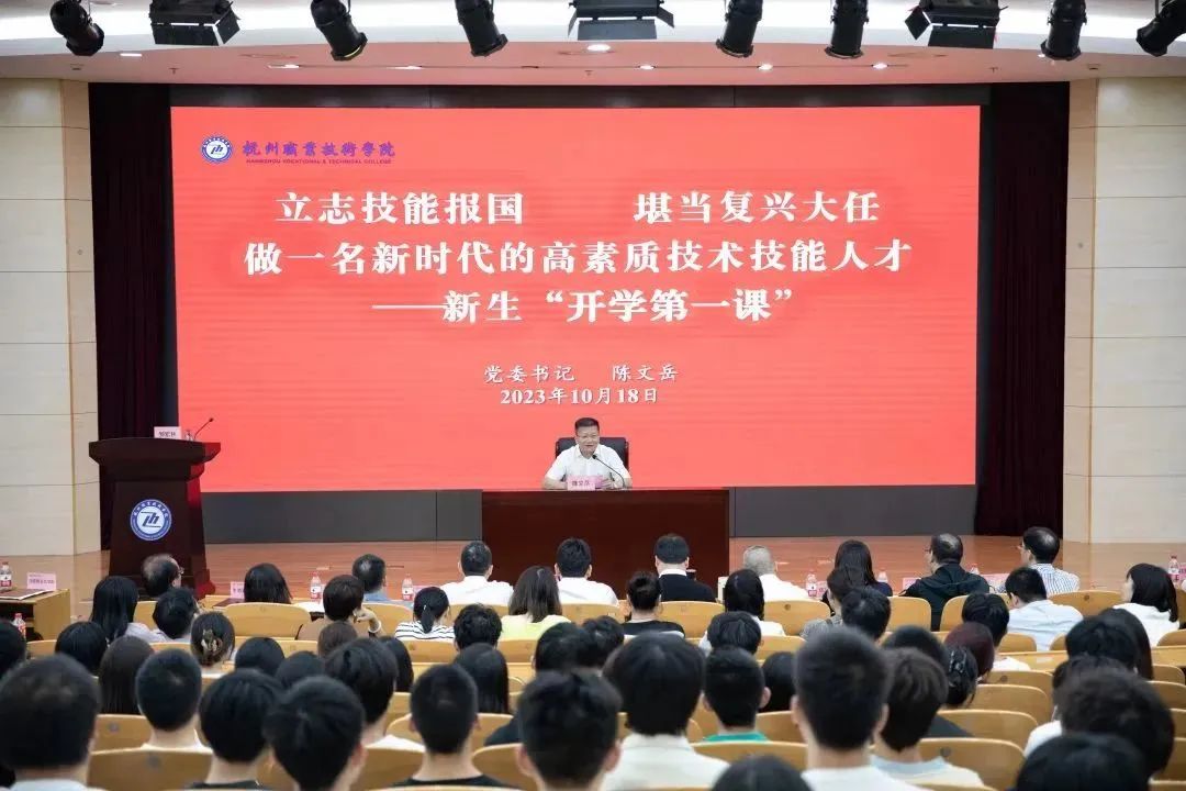 10月18日下午,我校新生“开学第一课”在行政楼报告厅顺利举行。学校党委书记陈文岳以“立志技能报国 堪当复兴大任 做一名新时代的高素质技术技能人才”为题,为2023级新同学们讲授了“开学第一课”。4800多名新生通过线上线下相结合的方式同上一堂课,办公室、宣传部、学工部负责人,各二级学院分管学生工作领导、学工办主任、辅导员和思政课教师代表现场参加。马克思主义学院院长邹宏秋主持“开学第一课”。