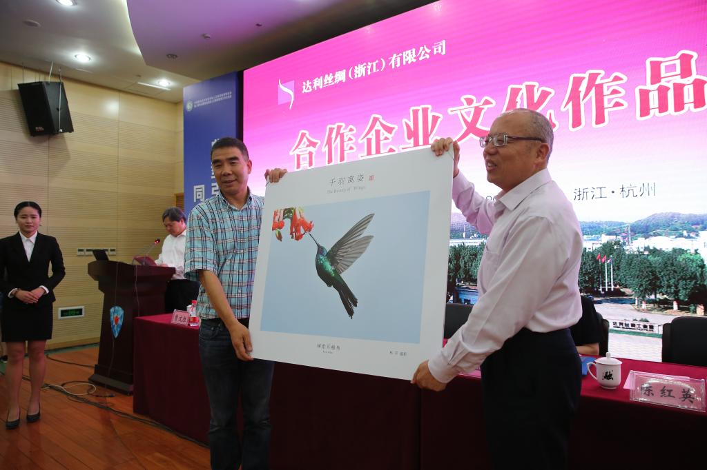 开幕式上,达利丝绸(浙江)有限公司董事长林平博士向学校捐赠了一批《“羽”众不同》摄影文化作品,这些作品将在杭职院永久展出。安蓉泉代表学校向其颁发了捐赠证书,这也是校企深度合作走向升华的印证。