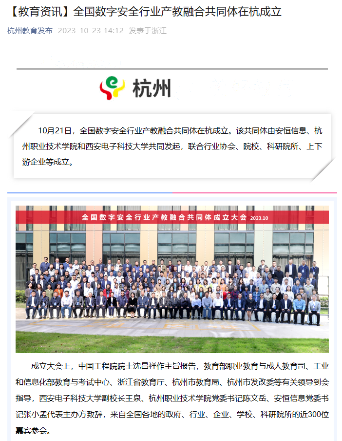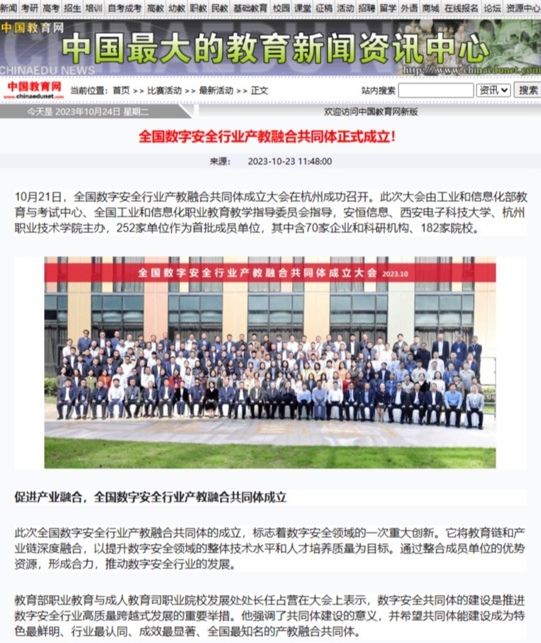 10月21日,全国数字安全行业产教融合共同体在杭成立,我校与安恒信息、西安电子科技大学为共同发起单位。随后中国教育在线、中国教育网、浙江在线、杭州教育发布、凤凰网、搜狐网、华龙网等多家媒体进行报道,对数字安全行业产教融合给予充分关注。