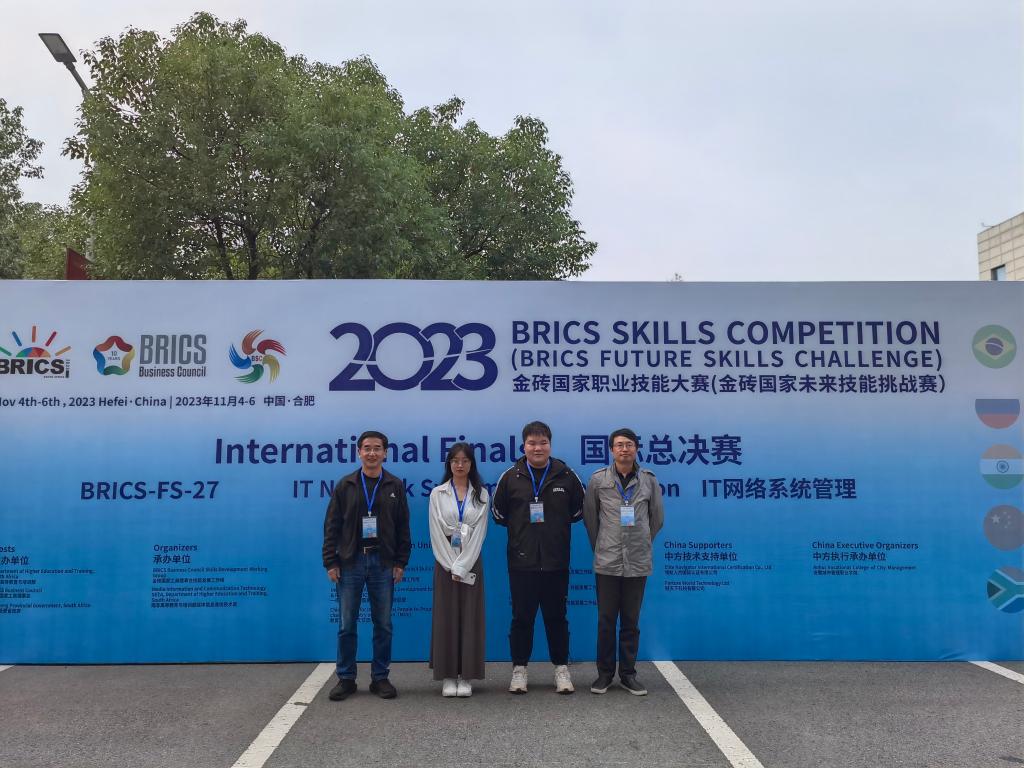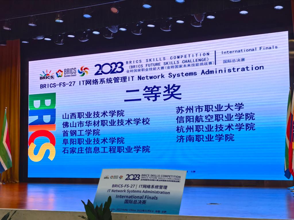 11月6日,2023金砖国家职业技能大赛之IT网络系统管理赛项国际总决赛在安徽城市管理职业学院落下帷幕,信息工程学院信息安全技术应用专业学生胡金龙、王妍博在申毅、赵刚两位老师的指导下,获得了全国二等奖的好成绩。