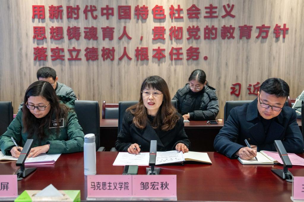 马克思主义学院党总支书记、院长邹宏秋结合上级文件精神,在会上作了题为《强内涵展形象 新阶段谋新篇》的汇报。她详细介绍了学院近年来在党建引领、教育教学改革、科研工作、师资队伍建设、大思政课建设等方面的做法和成绩,分析面临的压力、存在的问题以及下一步规划。