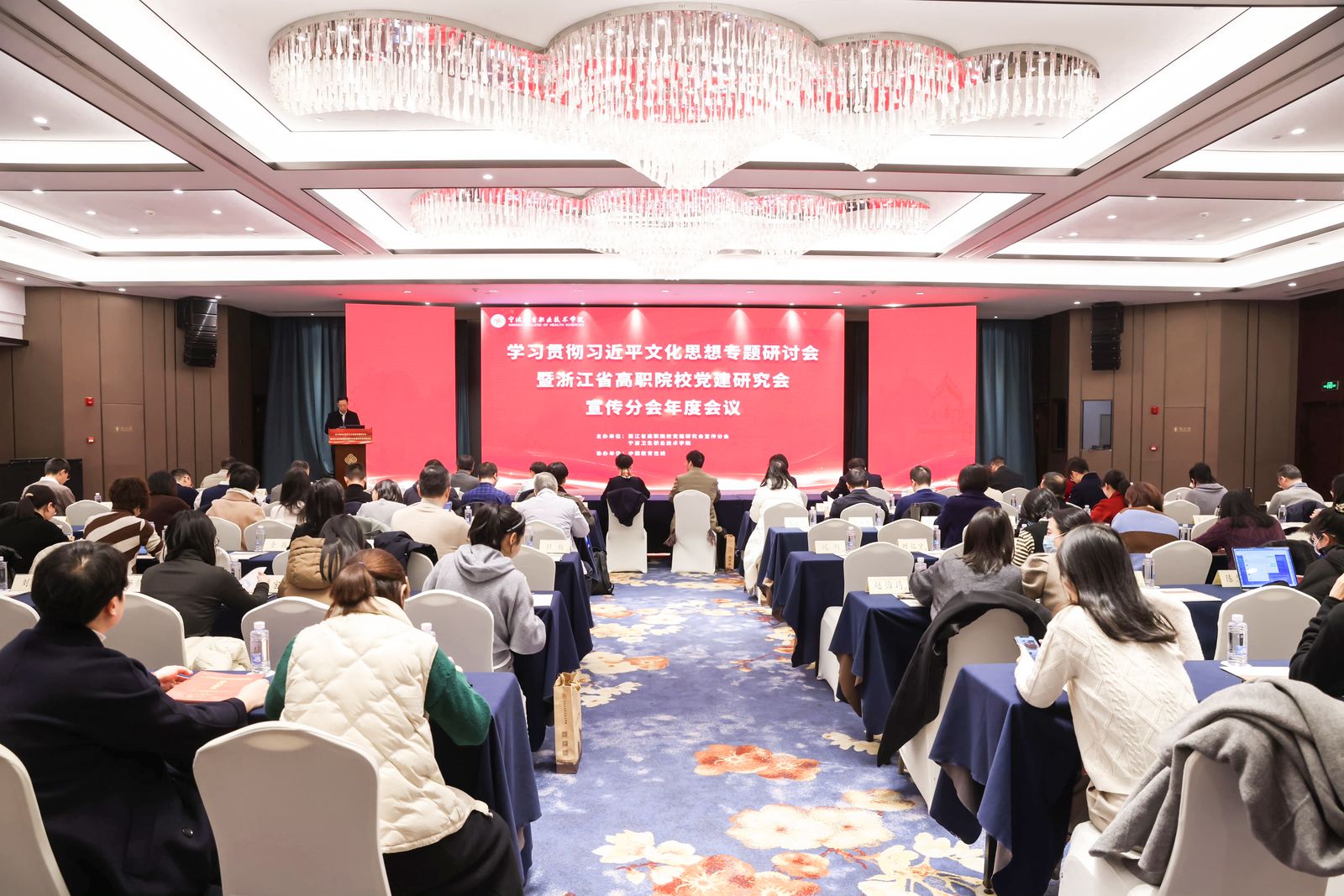 12月18日-19日,学习贯彻习近平文化思想专题研讨会暨浙江省高职院校党建研究会宣传分会年度会议在宁波召开,大会由浙江省高职院校党建研究会宣传分会、宁波卫生职业技术学院共同主办。省教育厅宣传教育与统战处副处长吕明再,宁波市教育局党委委员、副局长陈金辉,我校党委书记陈文岳,以及全省50余所院校的校领导、宣传部部长、马克思主义学院院长和从事宣传思想文化工作的教师近150人出席会议。