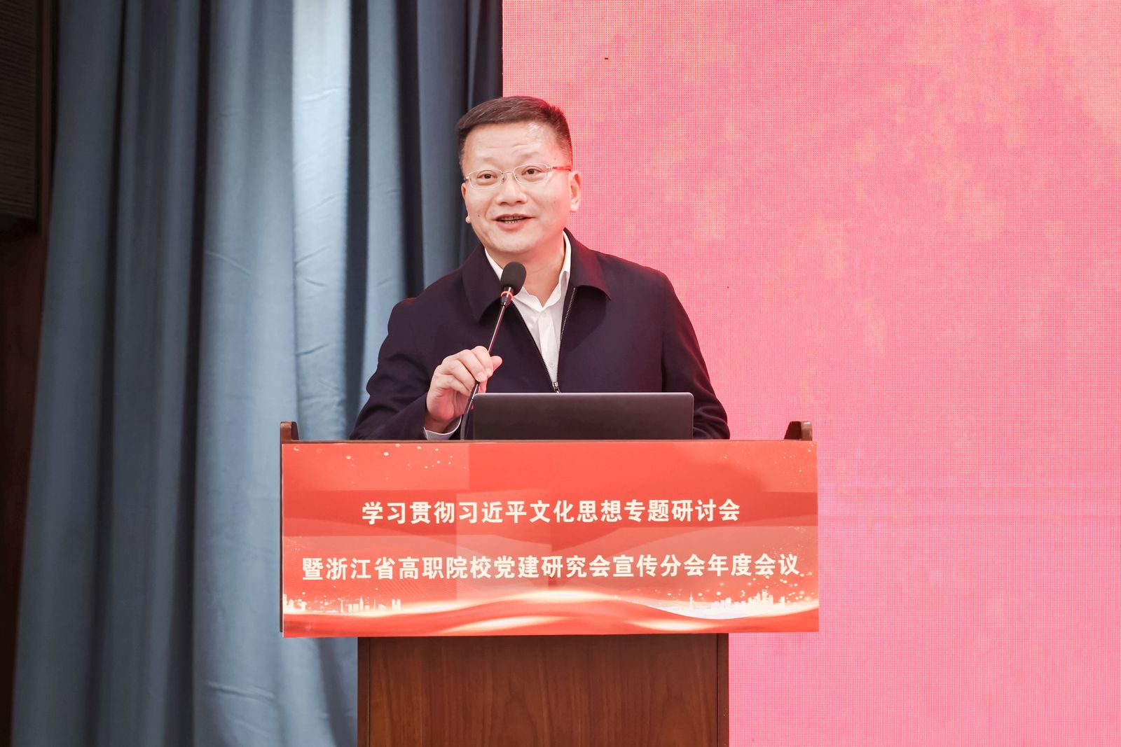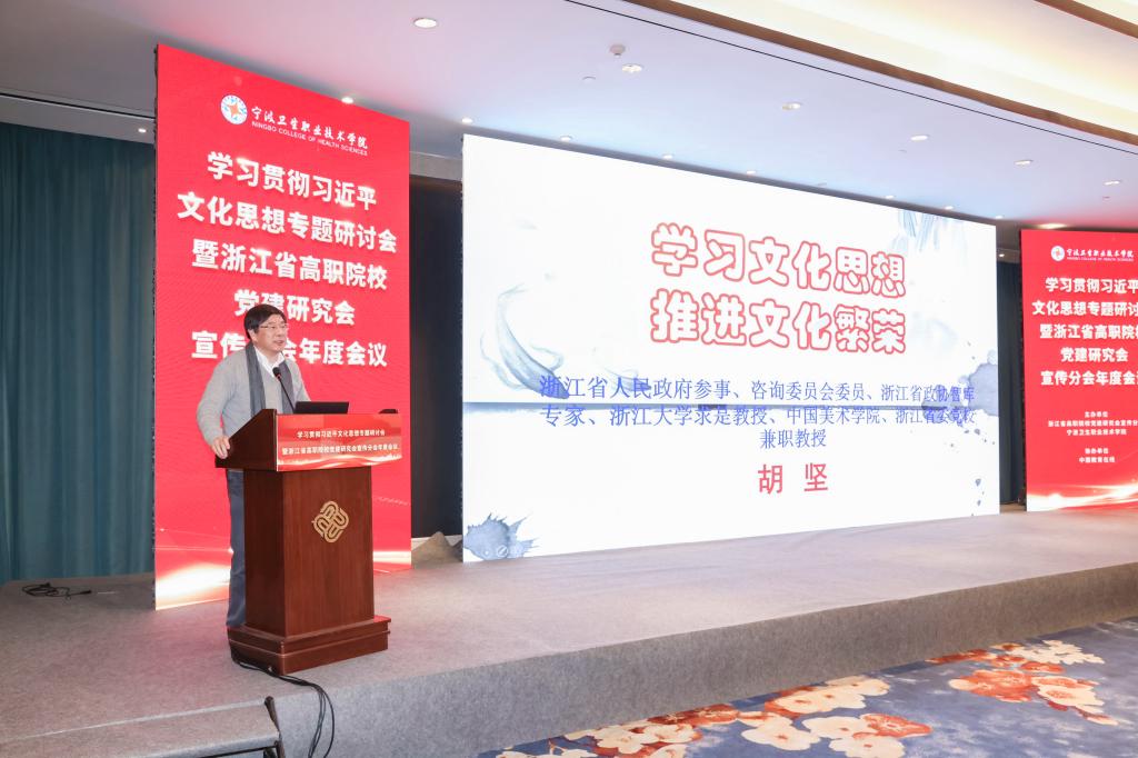 原浙江省委宣传部常务副部长、省委组织部副部长胡坚应邀作了题为《学习文化思想推进文化繁荣》的主旨报告。党委书记陈文岳作为省高职院校党建研究会宣传分会理事长单位负责人主持主旨报告环节,并与参会专家围绕高职院校宣传思想文化工作进行研讨交流。
