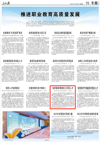 12月28日出版的《人民日报》,以《推进职业教育高质量发展》为题推出整版专题报道,记录了2023年职业教育论坛的召开情况。我校党委副书记陈泉淼在会上的发言“培养德技兼修的工匠型人才”,被完整展示报道。