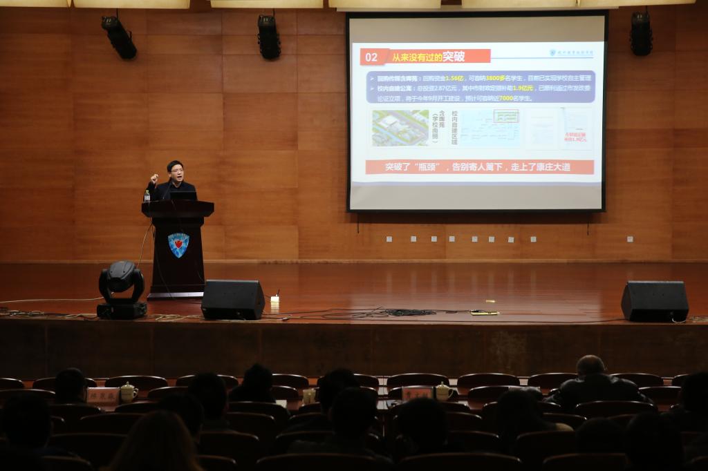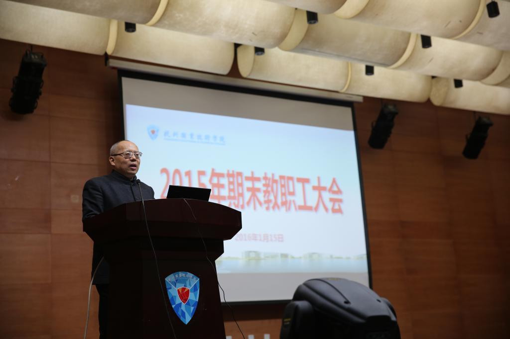 校长贾文胜在会上作了题为《感恩有你 幸福同行》的主题报告,他以10个“从来没有过的”关键词切入,向大家讲述了2015杭职重大事件和一个个精彩瞬间,赢得了全校教职工的阵阵掌声。随后,他从社会影响力、跨界融合力、内涵发展力、社会服务力、校园保障力、文化软实力、国际竞争力、党建优势力等八个方面全面回顾了2015年的工作。他指出,过去这一年学校改革发展所取得的这些成绩,离不开我们每一位可敬可爱的杭职人的不懈努力、精彩演绎和无私奉献。同时,他对迎接市党建工作考核验收、学生宿舍改扩建项目推进、“十三五”规划编制、四年制高职教育人才培养试点专业申报等寒假期间重点工作做了布置,并着重对假期内校园安全稳定工作进行了强调。最后,贾文胜祝福全校教职工度过一个平安祥和的春节和幸福快乐的寒假,并希望大家在寒假期间在安全上多操心、工作上多尽心、家庭上多爱心。