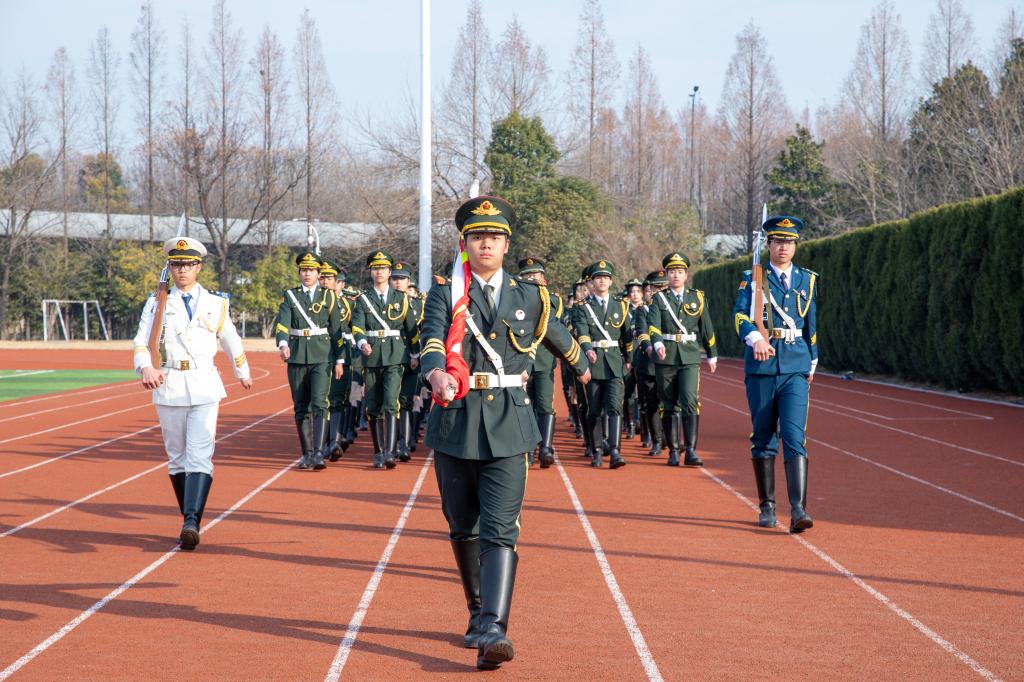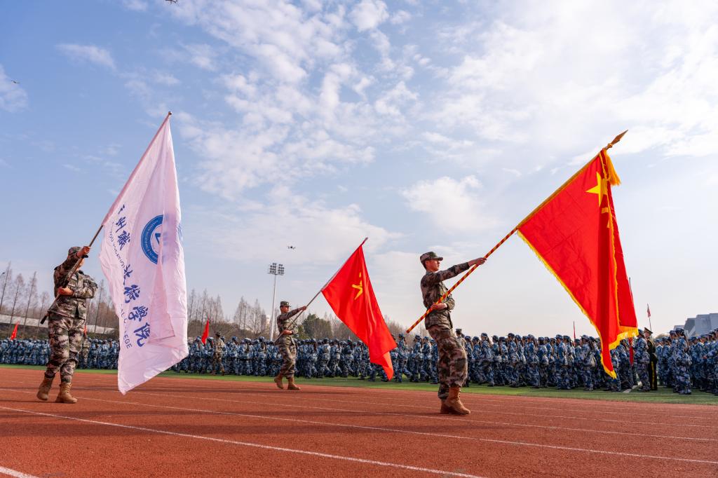在激昂的国歌声中,五星红星冉冉升起,在场全体师生肃立,总结大会拉开帷幕。步履铿锵,目光坚定,在护旗手的护送下,军旗、团旗、校旗依次通过主席台,昂扬的气势振奋着现场每位师生的心。