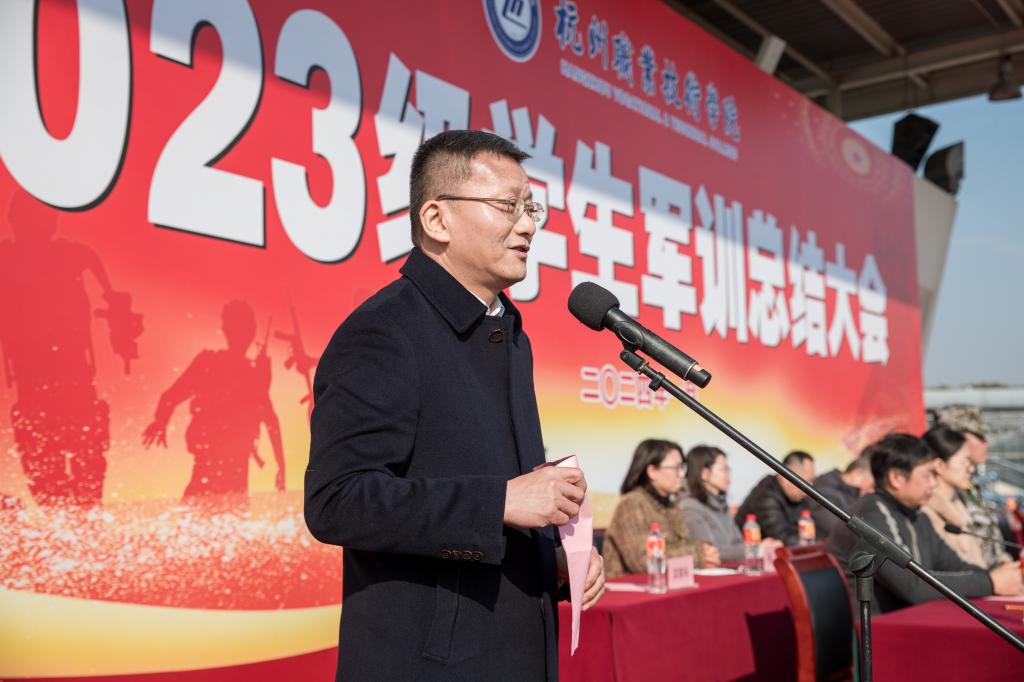 陈文岳强调此次军训是我校首次完全由本校退役士兵承训的高水平军训,整个军训过程中,同学们对抗严寒、磨砺意志、严守纪律、严格要求。在学校凝心聚力打赢“新校区建设”、“双高建设”、“申本创大”三大攻坚战的关键时刻,军训涵养了杭职人不怕苦的特点和不怕输的特性,锤炼了杭职人勇夺第一、勇攀高峰的工匠精神。