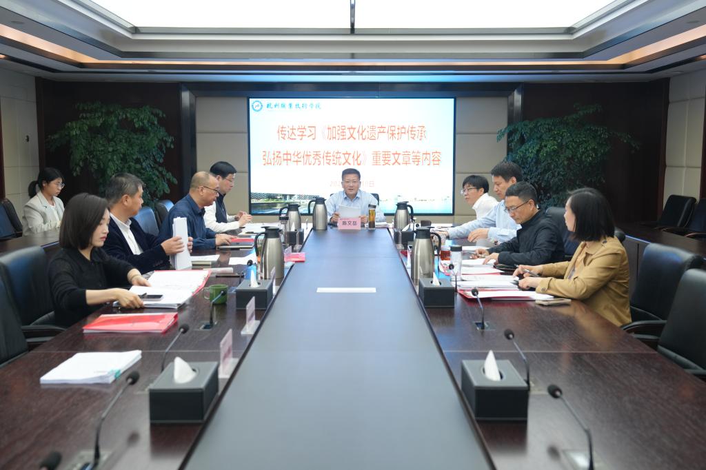 4月19日上午,杭职院党委召开“第一议题”学习会,深入学习贯彻习近平总书记关于文化遗产保护传承的重要论述,部署学校贯彻落实相关要求。校党委书记陈文岳主持并讲话,全体校领导班子成员参会。