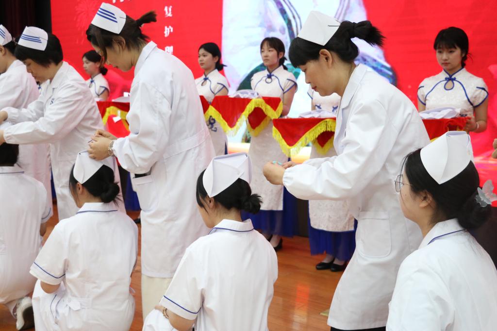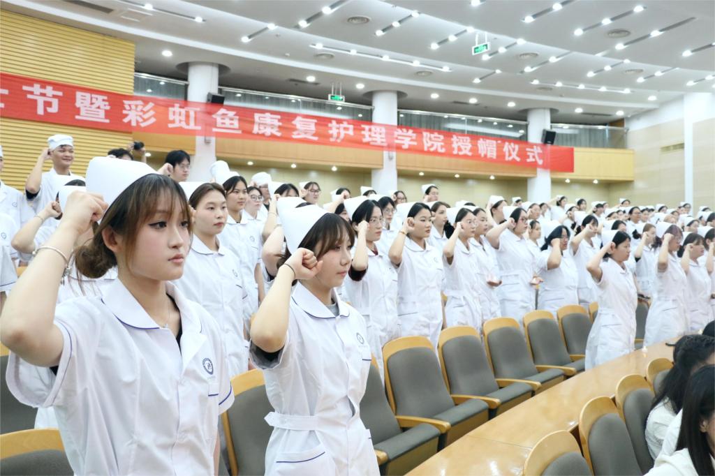 彩虹鱼康复护理学院直属党支部副书记杨旭辉、杭州彩虹鱼康复护理院行政人事总监阴聪聪、浙江省新华医院护理部副主任朱铮、学生代表分别发言后授帽仪式在庄严的乐曲声中进行,朱铮等10位护理界前辈将圣洁的燕尾帽戴在140名护生头上,鞠躬传接、起立转身,代表着责任和护理精神的传承。在护理界前辈金惠露的带领下,护生们在南丁格尔画像前庄严誓言。
