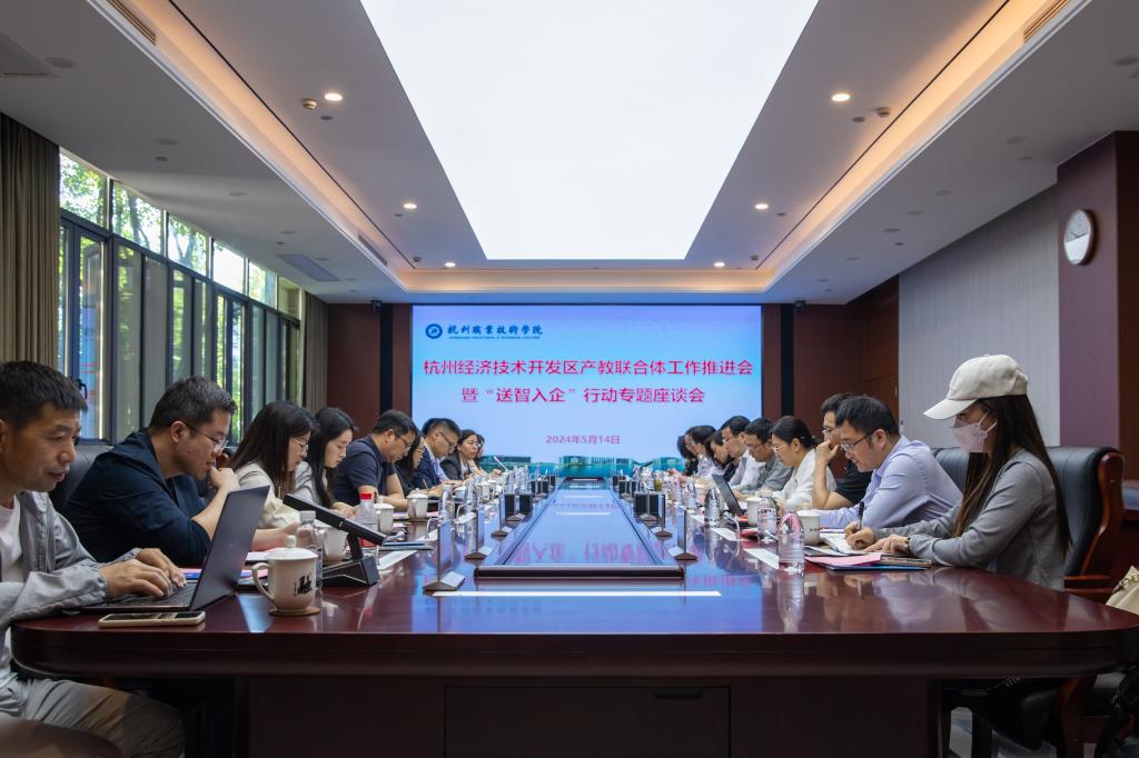 5月14日下午,杭州经济技术开发区产教联合体工作推进会暨“送智入企”行动专题座谈会在我校召开,钱塘新区党工委委员、区委常委周妙荣,区高层次人才发展服务中心主任陈树坚,区发展改革局副局长李亚军,科学城管理办公室副主任韩翠华,我校党委副书记赖明诚,党委委员、副校长楼晓春,党委委员、组织部部长韩亮,以及相关职能部门负责人和区企业代表等参加座谈,会议由校党委副书记赖明诚主持。