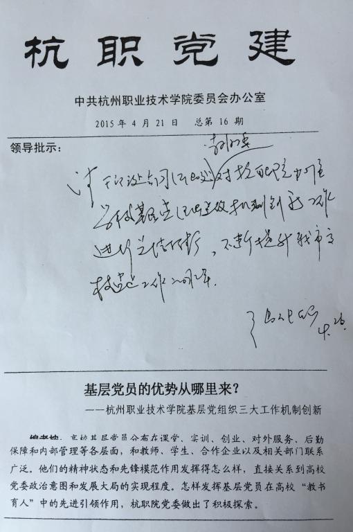 4月26日,市委常委、组织部长张仲灿对我校第16期《杭职党建》文章《基层党员的优势从哪里来?——杭州职业技术学院基层党组织三大工作机制创新》进行批示,批示全文如下:
