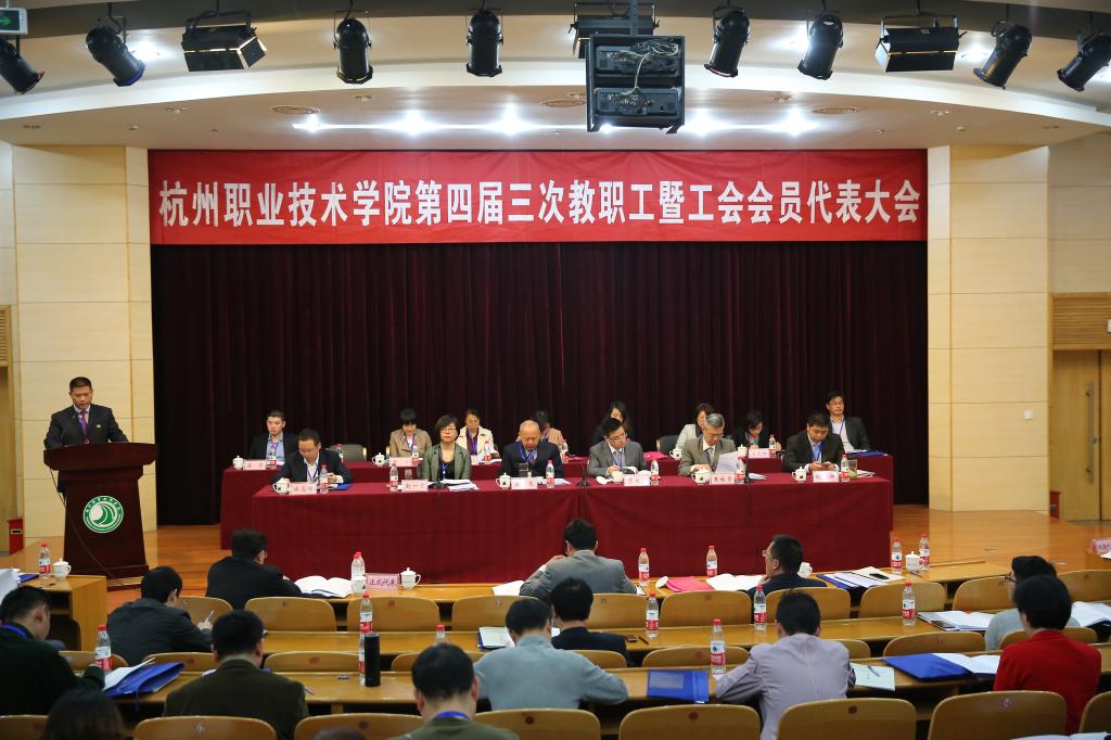 4月24日,杭州职业技术学院第四届教职工暨工会会员代表大会第三次会议在行政楼报告厅举行。我校党委班子成员安蓉泉、贾文胜、赵一文、张洪宪、许淑燕、陈泉淼、陈加明、孙爱国、金徐伟出席会议,“双代会”代表、特邀代表、列席代表参加了会议,听取并审议了校长工作报告、工会工作报告、提案工作报告;审议了工会经费审查工作报告、《杭州职业技术学院章程》(听取意见稿);听取了《学校党政领导班子关于教职工意见建议的整改情况反馈》;顺利完成了第四届工会委员会委员替补工作。