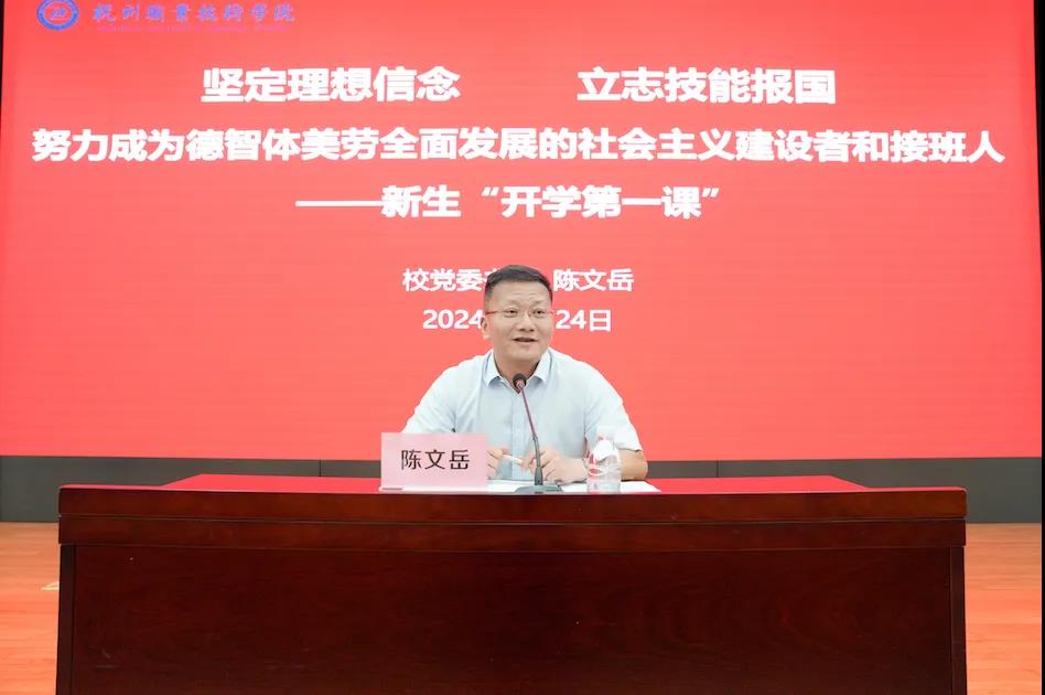 9月24日下午,党委书记陈文岳以“坚定理想信念 立志技能报国 努力成为德智体美劳全面发展的社会主义建设者和接班人”为题,在行政楼二楼报告厅为新生们讲授了“开学第一课”。