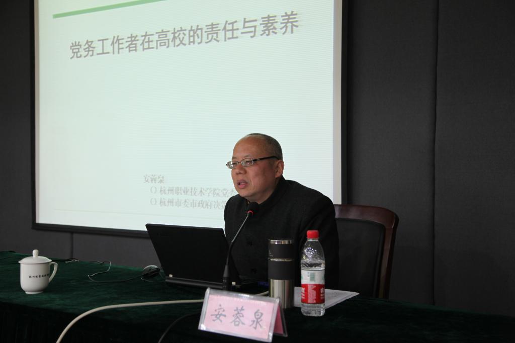 下午培训由安蓉泉作题为《党务工作者在高校的责任与素养》的专题讲座。他通过生动的案例,点出基层党组织应具备的“思想引导、组织干预、纪律约束、作风示范”四方面重要责任结合自身多年工作经历,与学员们谈了党务工作者应具备的几方面素养:一是定位意识,认清党建工作的目的是服务教学、服务学生、服务中心工作;二是服务意识,只有努力做好服务才能凝聚人心,推动工作;三是方法意识,希望大家多动脑子,围绕党建工作“引领性、服务性”,从支部、部门实际出发创新性的开展党建活动;四是业务素养,党务干部要不断结合工作及时补充缺少的素养,真正掌握情况和问题才能避免“隔靴搔痒”;五是党建素养,要具备把党建理论知识和党建工作实际结合的能力;六是综合素养,包括思想素养、理论素养、文字素养、传播素养等等。最后他谈了党务干部应如何培养自身素养,希望各位学员通过“艰苦学习、躬身实践、勤于思考、完善思维、开阔胸怀”五个方面的努力提升自己素养,从而在自己岗位上做出成绩,为杭职院党建工作的科学化发展做出贡献。