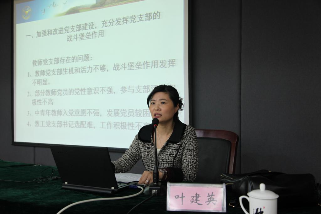 当天上午培训安排浙江大学党委组织部组织办公室叶建英主任授课。她作了题为《以钉钉子精神抓好高校党建工作——浙江大学党建工作介绍》的专题讲座从支部建设、发展党员建设、院级分党委建设三个角度介绍了浙江大学近年来的党建工作思路和主要举措。与大家分享了开展“五好党支部”建设(领导班子好、党员队伍好、工作机制好、工作业绩好、群众反映好),推行支部“五个必访”(党员生病住院时、工作学习有困难时、党组织变动时、有负面情绪或思想时、无故不参加活动时)等特色工作经验,令听课学员深受启发。