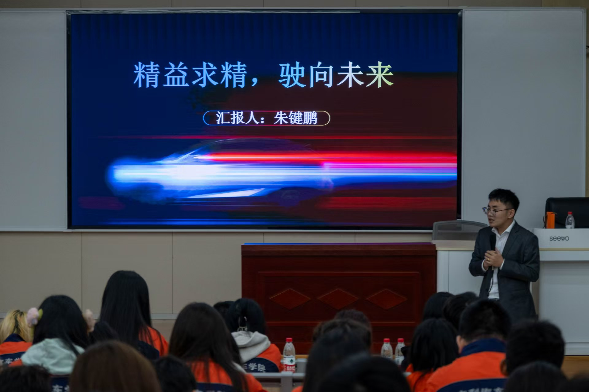 10月23日下午,我校2013级吉利汽车学院优秀校友、杭州骏宝行MINI用户运营经理及BMW BDC主管朱键鹏返校,开展题为《精益求精,驶向未来》的精彩讲座,150余名师生代表参加,学工部、吉利汽车学院相关负责人参加讲座。