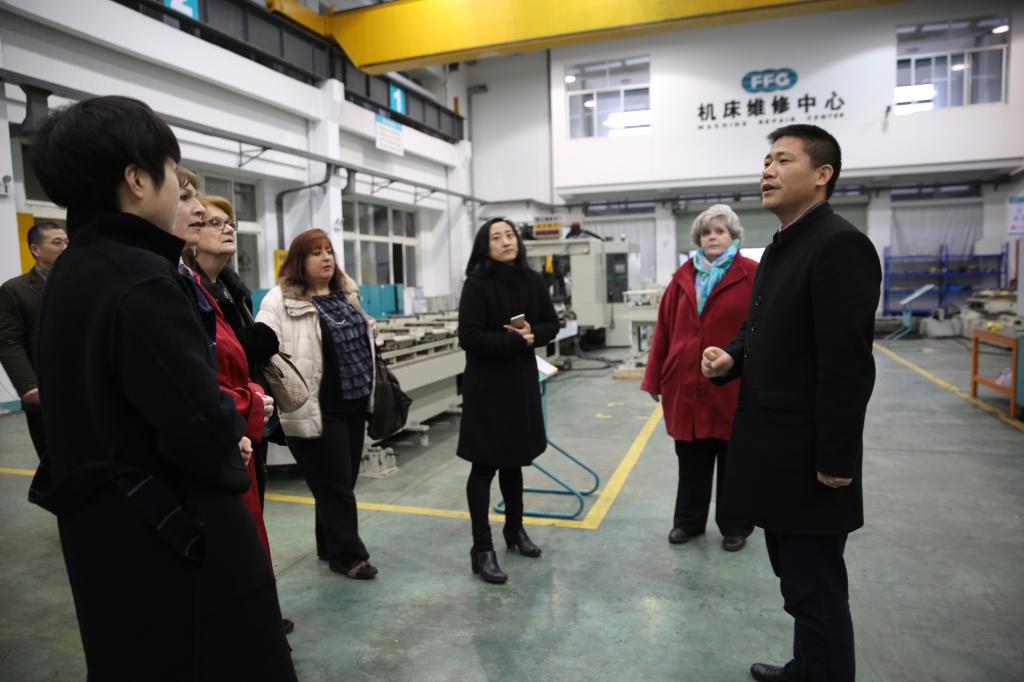 在副校长陈加明、彩虹鱼康复护理学院院长李培英等人的陪同下,KrisMauk一行参观了友嘉机电学院、公共实训基地、达利女装学院和普达海动漫学院。