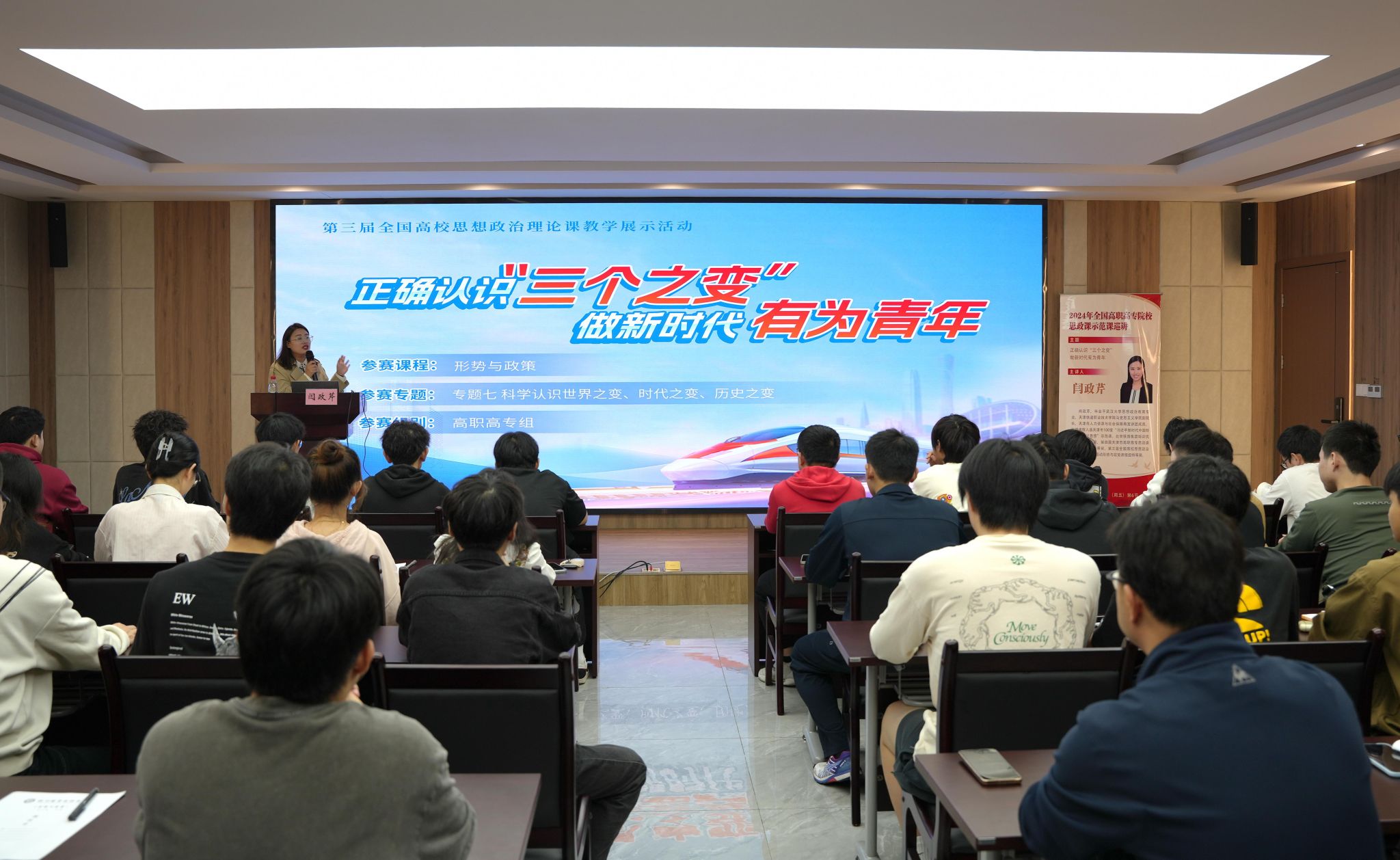 闫政芹以《正确认识“三个之变”,做新时代有为青年》为主题,为自动化2411班讲授示范课。她用生动的案例、翔实的数据和富有感染力的语言,将抽象的理论知识与现实生活紧密结合,深入剖析了“世界之变、时代之变、历史之变”的内涵要义,引导在场师生深刻领会“三个之变”对青年成长发展的机遇与挑战,激励学生成长为有理想、敢担当、能吃苦、肯奋斗的新时代有为青年。闫老师深厚的专业素养、精湛的教学技艺和独特的授课风格,使整个教学过程引人入胜,为思政课教师提供了优质的教学范本。