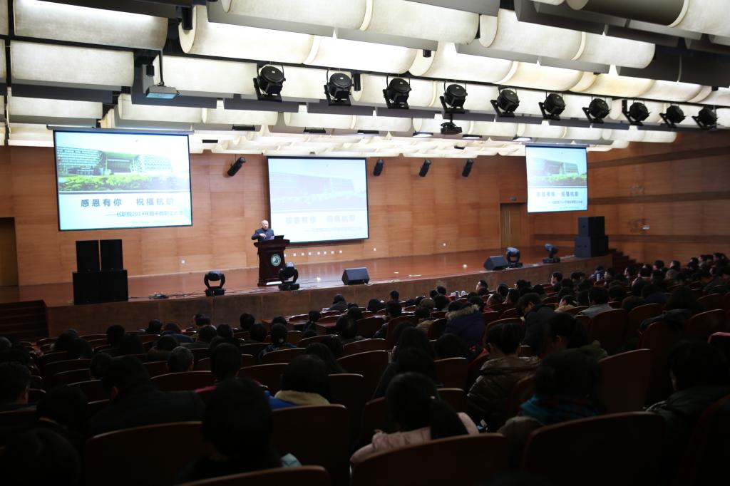 会上,校长贾文胜以“感恩有你,祝福杭职”为题,从领导重视、发展提速,捷报频传、备受关注,跨界融合、创新发展,深耕内涵、稳步提升,校园文化、立体推进,开放办学、顺势发力等六个方面,全面回顾了我校2014年的工作情况。他认为,过去一年是学校加快完成“十二五”规划、实现国家骨干高职院校建设目标的攻坚之年,更是全体杭职人在高职教育改革道路上披荆斩棘、锐意创新的一年,学校的发展迎来了更加喜人的局面,获得了国家级教学成果一、二等奖,全国教育系统先进集体,全国首届高职高专“挑战杯”特等奖、一等奖等荣誉。他指出,2015年将是承前启后、继往开来的一年,将迎来骨干校冲刺优秀、十二五完美收官、十三五蓝图绘制等重任,需要全体杭职人凝心聚力、再创辉煌。