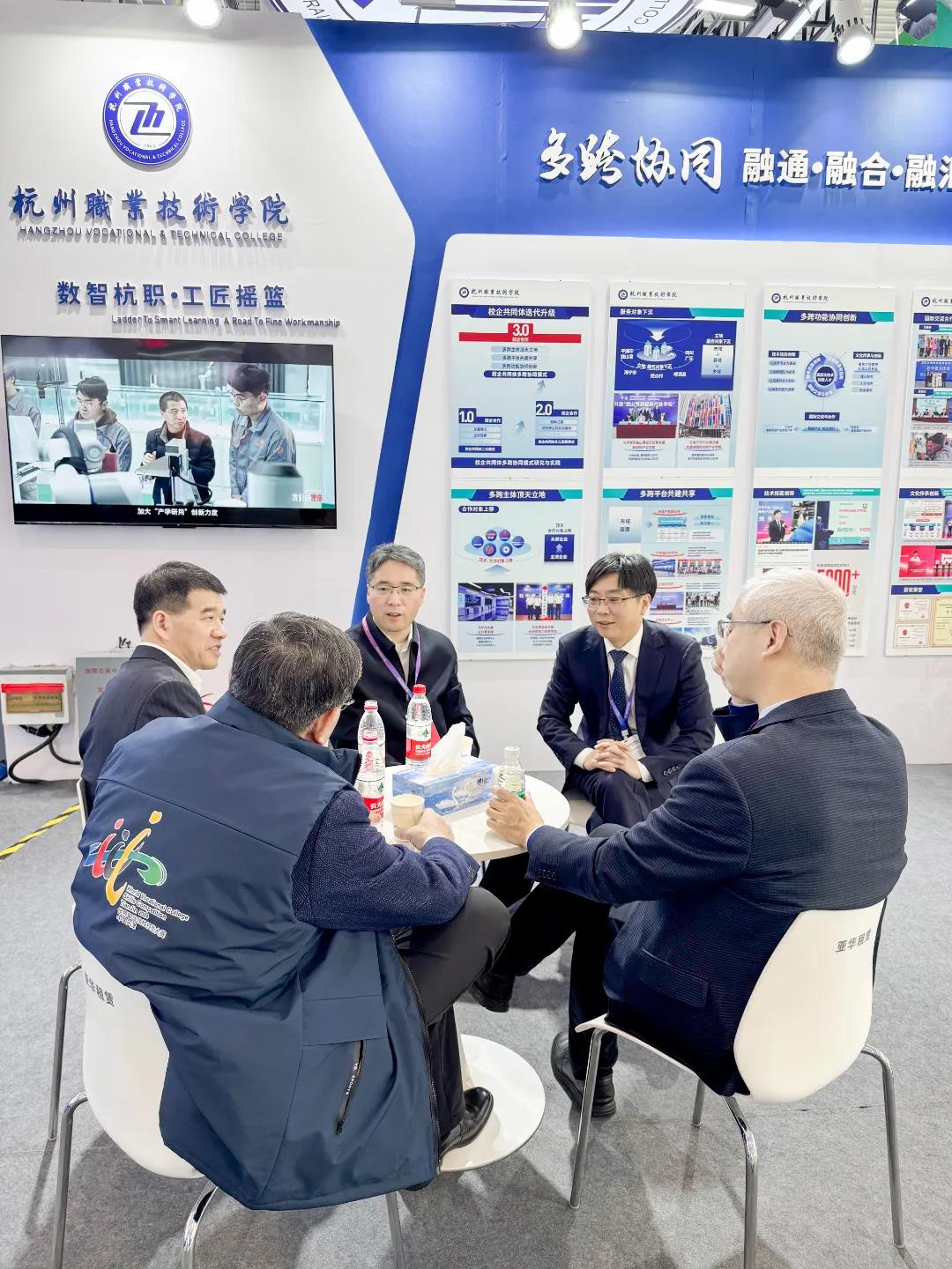 大会期间,中共浙江省委教育工作委员会委员,省教育厅党组成员、副厅长陈峰带队专程来我校展区参观指导。基于校企共同体多跨协同办学探索实践,徐时清重点介绍了我校的改革创新发展成效。