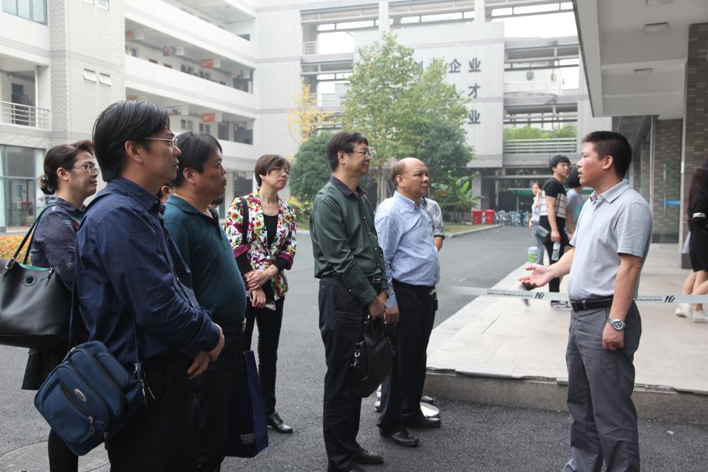 来宾一行在陈加明的陪同下参观了友嘉机电学院、学校实训中心暨杭州市公共实训基地、达利女装学院、普达海动漫艺术学院和高职学生创业园。