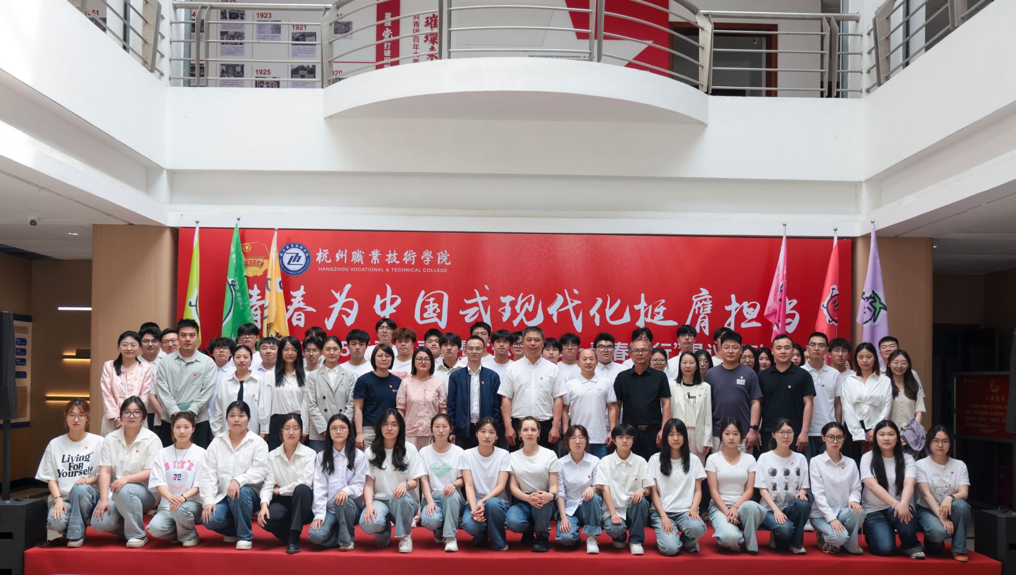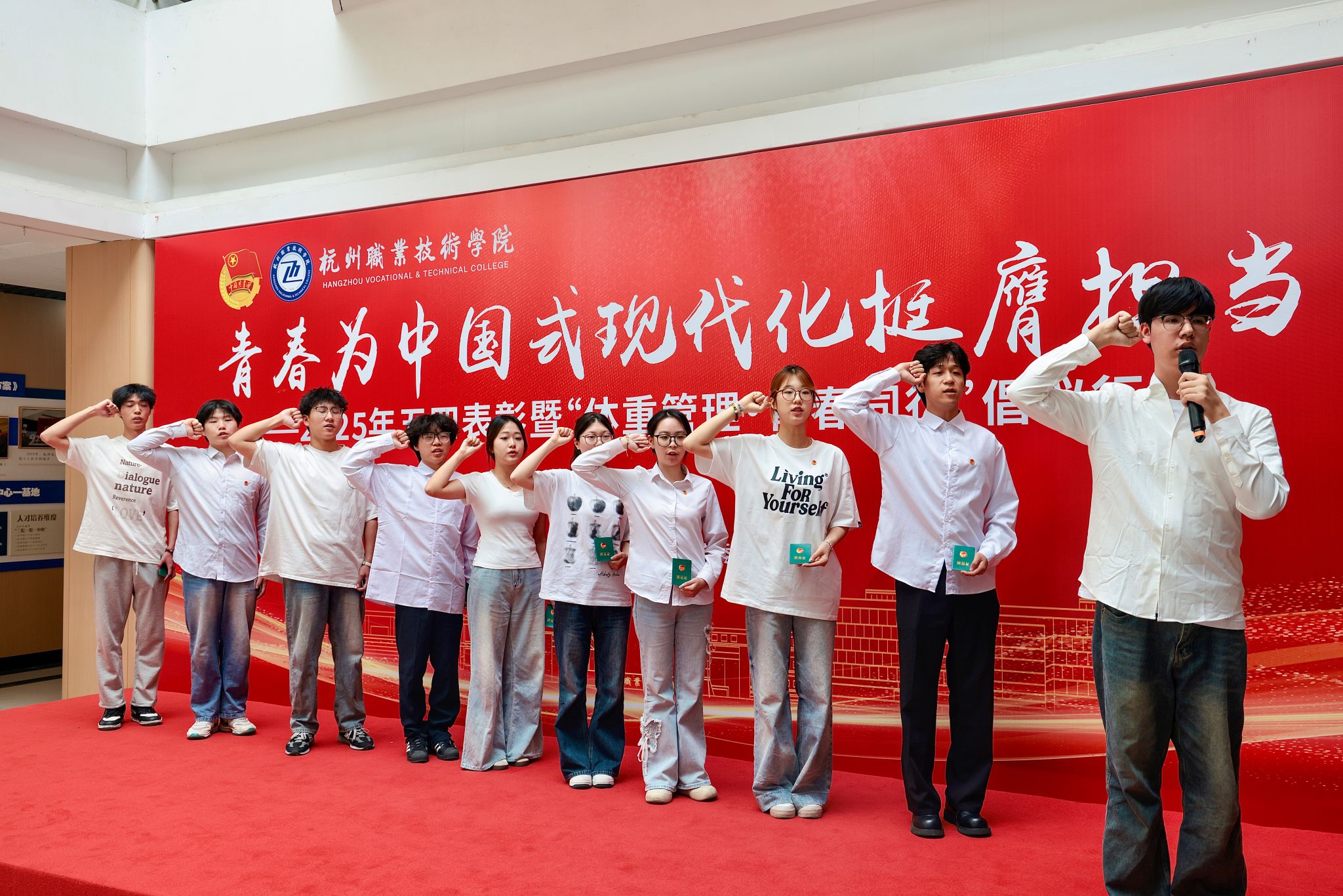 在全团上下深入学习宣传贯彻习近平总书记重要讲话和给谢依特小学戍边支教西部计划志愿者服务队队员回信精神之际。5月7日下午,学校在学活中心大厅举办了以“青春为中国式现代化挺膺担当”主题的五四表彰大会暨“体重管理·青春同行”健康倡议行动。学校党委委员、副校长程利群出席活动并致辞。共青团钱塘区委书记陈州峰,区卫健局、民政文旅体局相关负责人应邀出席,党委学工部、校团委、公共基础部、后勤服务中心负责人以及各二级学院团总支负责人、青年师生代表等70余人到场参加。