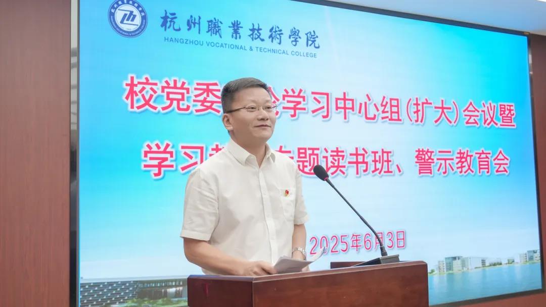 6月3日下午,杭州职业技术学院在行政楼 117 会议室召开党委理论学习中心组(扩大)学习会暨学习教育专题读书班、警示教育会,深入学习习近平总书记关于加强党的作风建设的重要论述和中央八项规定及其实施细则精神。在校党委领导班子成员、全体中层干部、“菁英计划”人员参加会议。市纪委监委驻市教育局纪检监察组副组长洪悬彬到场巡听旁听。校党委书记陈文岳主持会议。