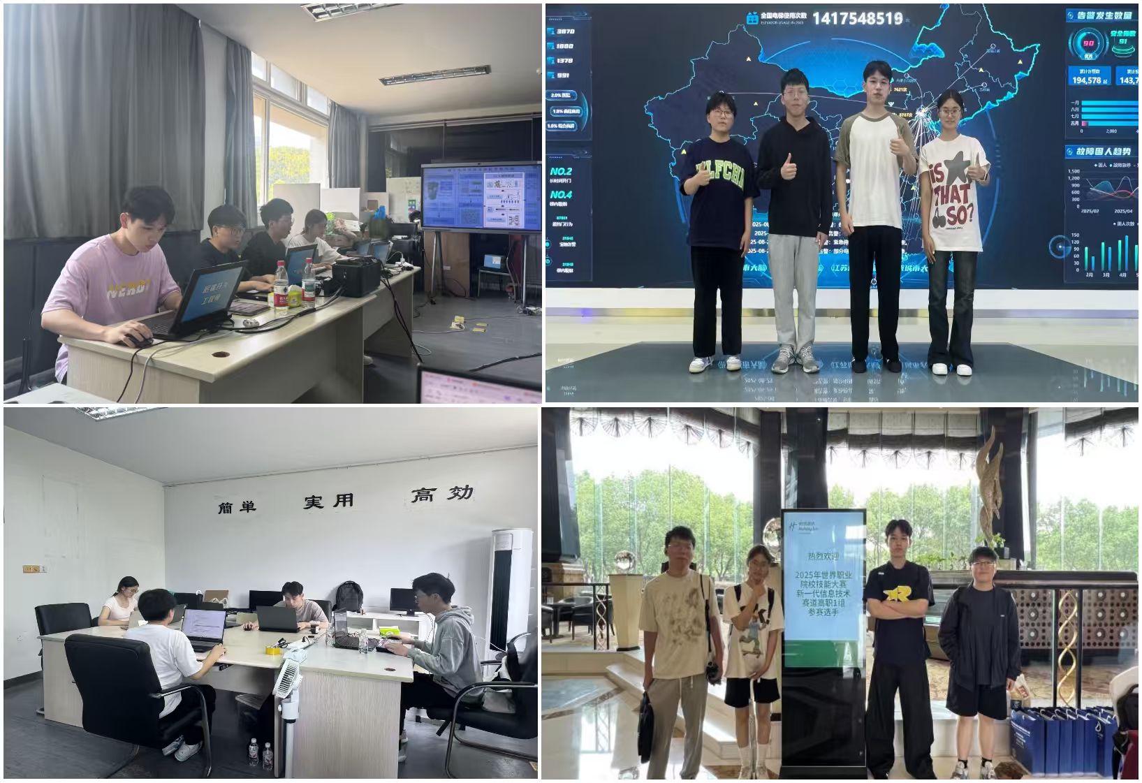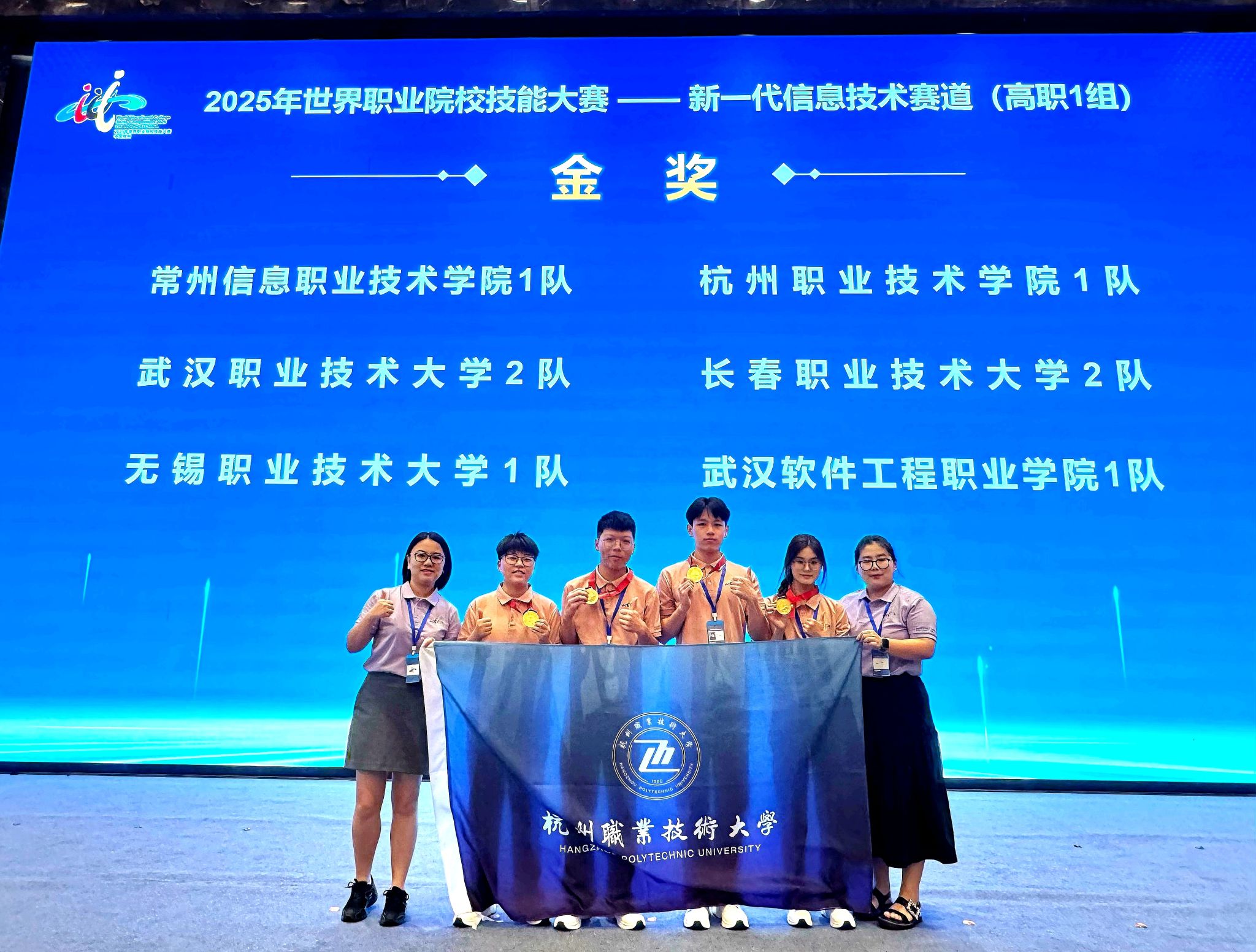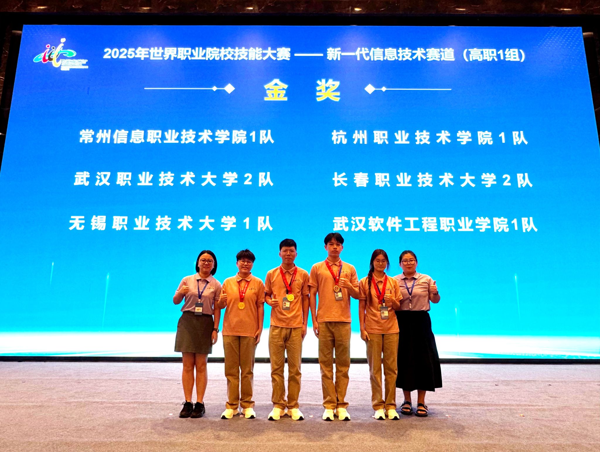 9月7日至12日,2025年世界职业院校技能大赛新一代信息技术赛道高职组总决赛在江苏常州举行。全国各省、自治区、直辖市和新疆生产建设兵团的251支代表队、1000余名参赛选手齐聚赛场。我校信息工程学院学生钱诗蝶、崔敏琪、王进、陈乃真(指导教师黄莉、汪露雲)组成的参赛队,凭借扎实专业功底、出色技术实力和默契团队协作,从众多强手中脱颖而出,斩获金奖!